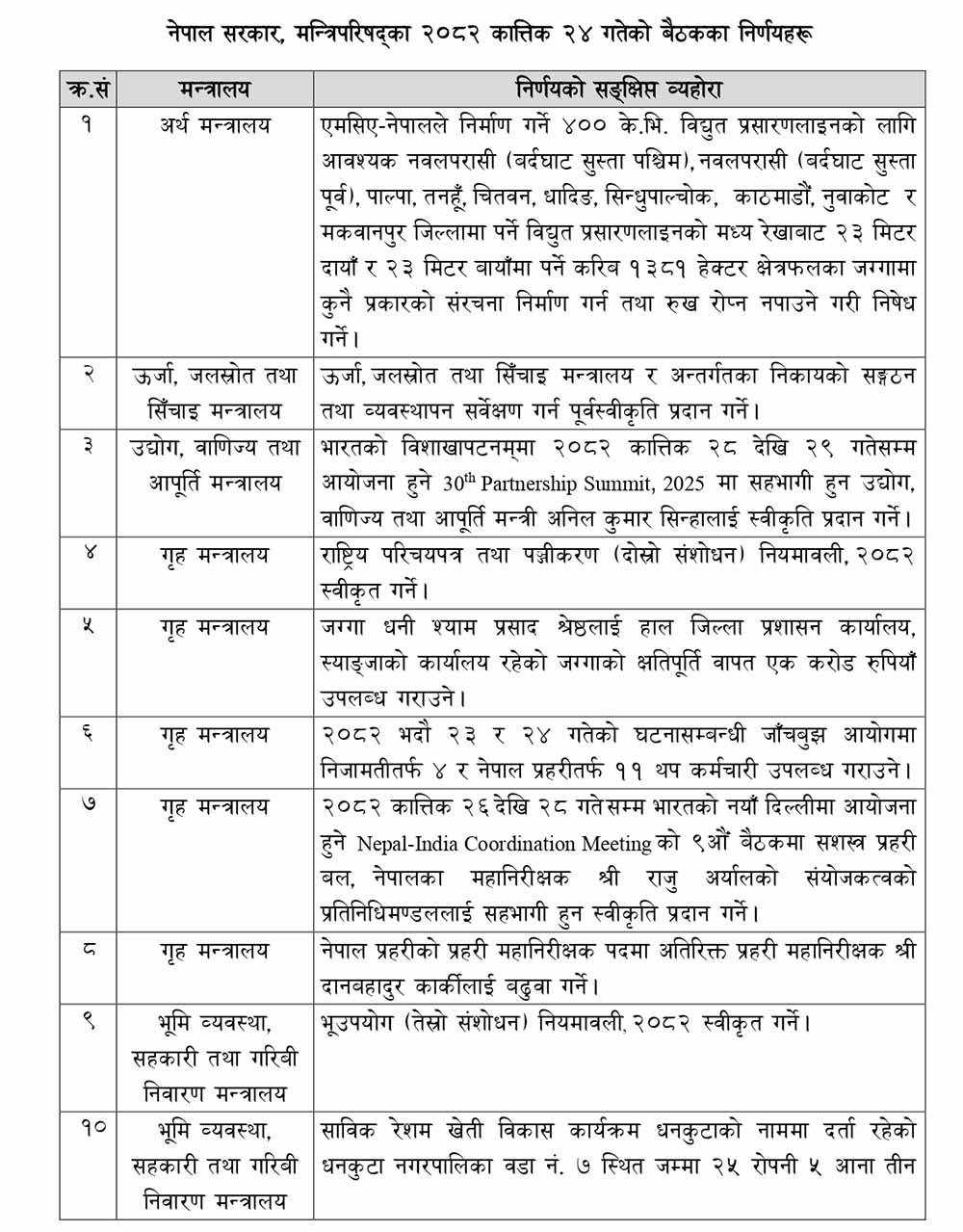 काठमाडौं । कात्तिक २४ गते बसेको मन्त्रिपरिषद्को बैठकका निर्णयहरू सार्वजनिक गरिएको छ ।