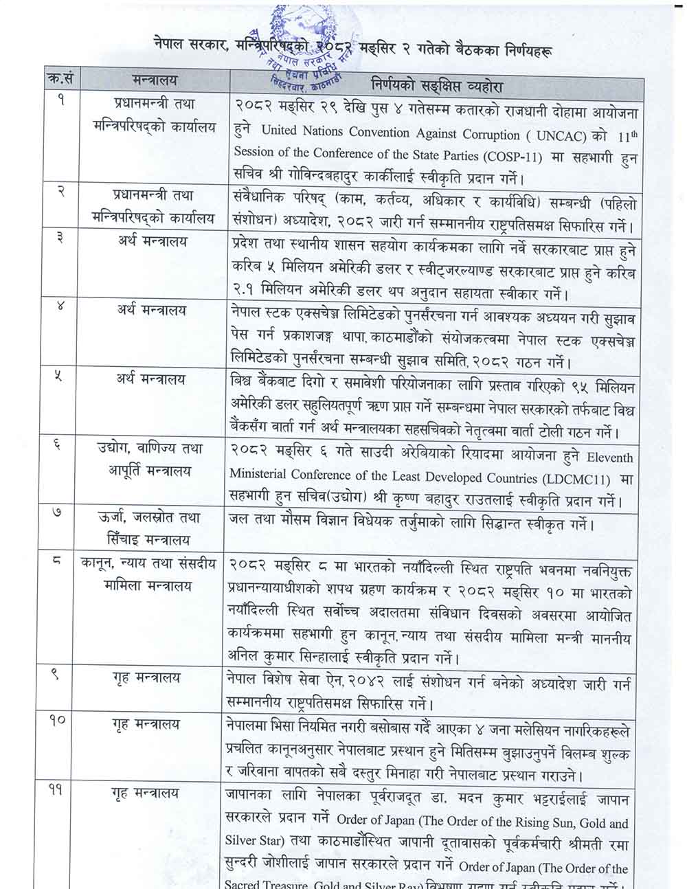 काठमाडौं । मङ्सिर २ गते बसेको मन्त्रिपरिषद्को बैठकका निर्णयहरु सार्बजनिक गरिएको छ ।