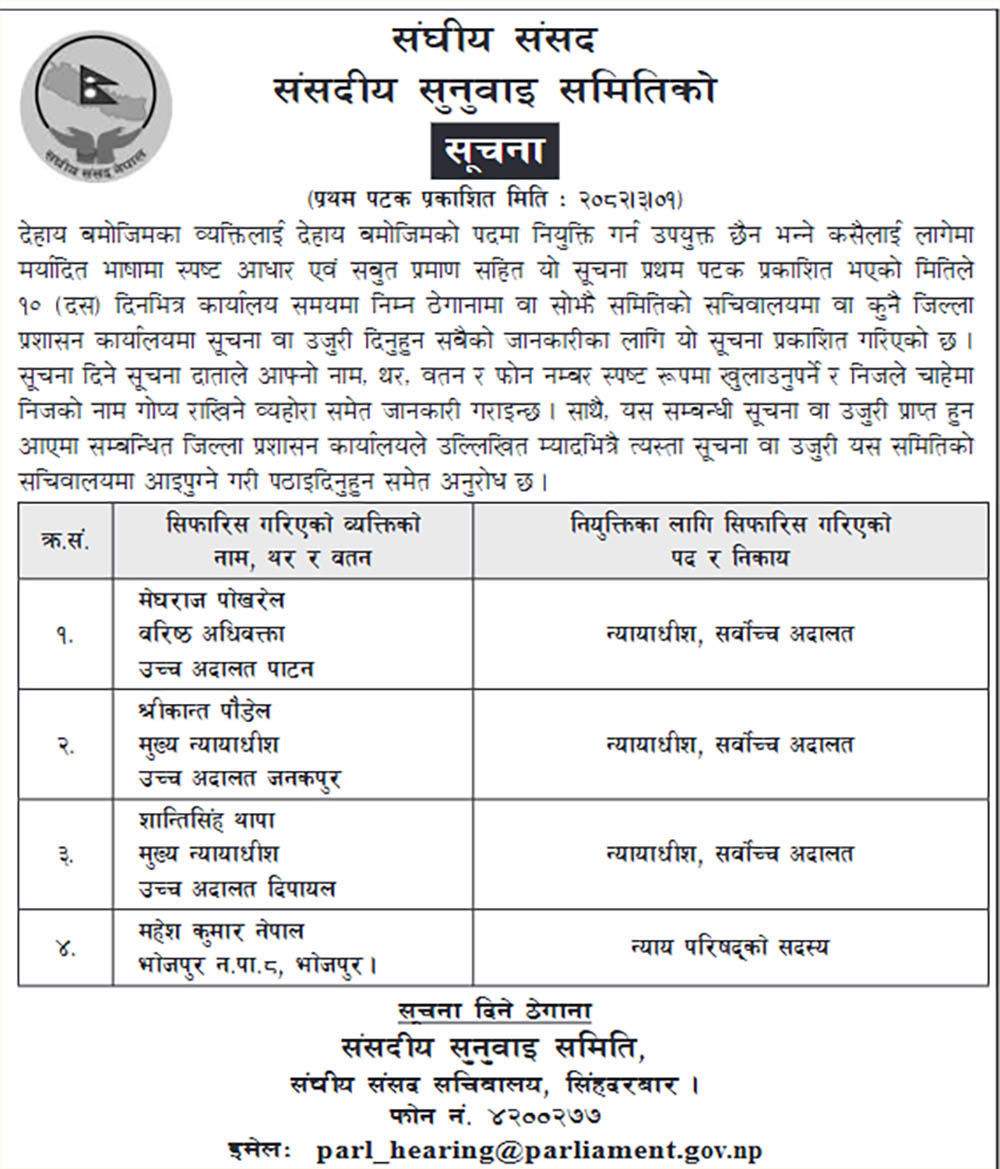 समितिले संसदीय सुनुवाइ समितिको कार्यविधि, २०८० को दफा १२ बमोजिम प्रस्तावित व्यक्तिहरूका सन्दर्भमा सर्वसाधारणलाई जानकारी दिन तथा कुनै सूचना वा उजुरी भए समितिसमक्ष बुझाउन सूचनालाई सरकारी सञ्चारमाध्यम तथा विद्युतीय सञ्चारमाध्यममार्फत सार्वजनिक गर्ने निर्णय गरेको थियो ।