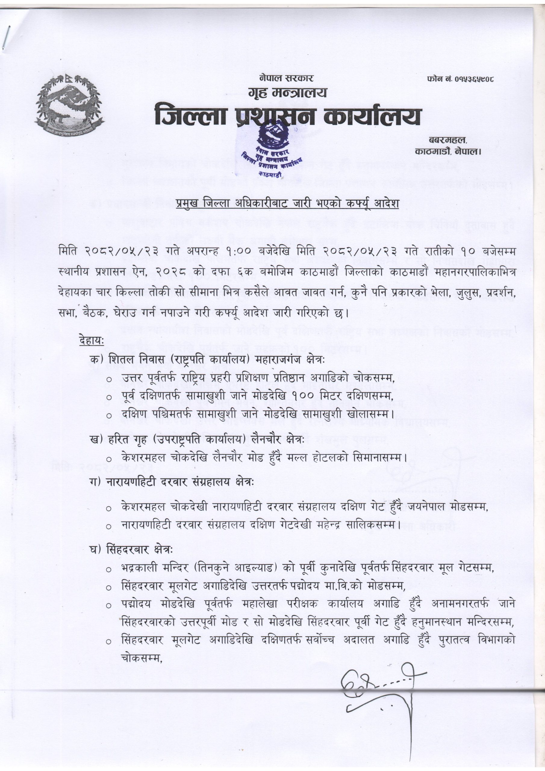 प्रशासनले राष्ट्रपति कार्यालय शितलनिवास, उपराष्ट्रपति कार्यालय हरित गृह, नारायणहिटी दरबार सङ्ग्रहालय र सिंहदरबार क्षेत्रलाई समेटेर नयाँ आदेश जारी गरेको छ ।