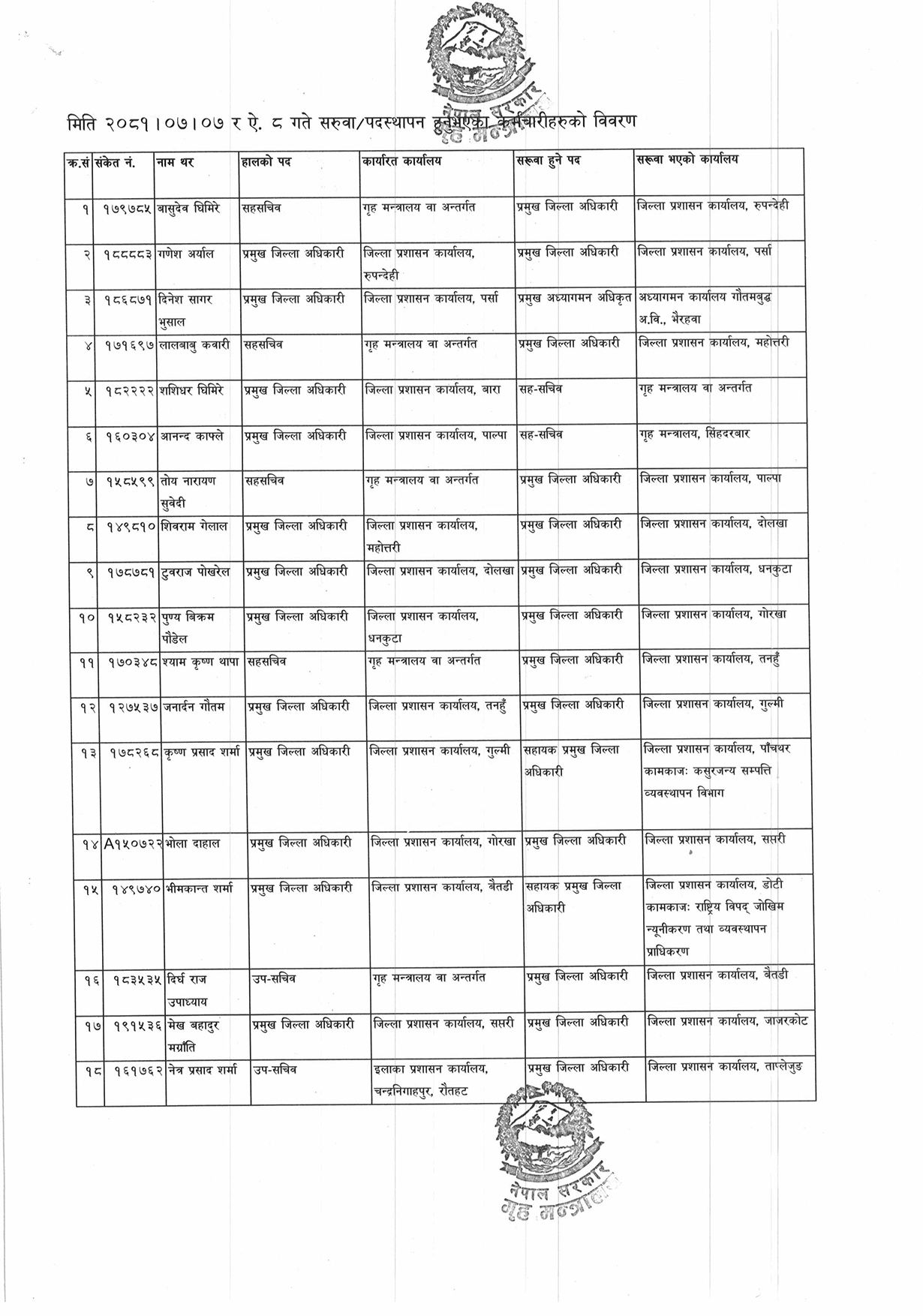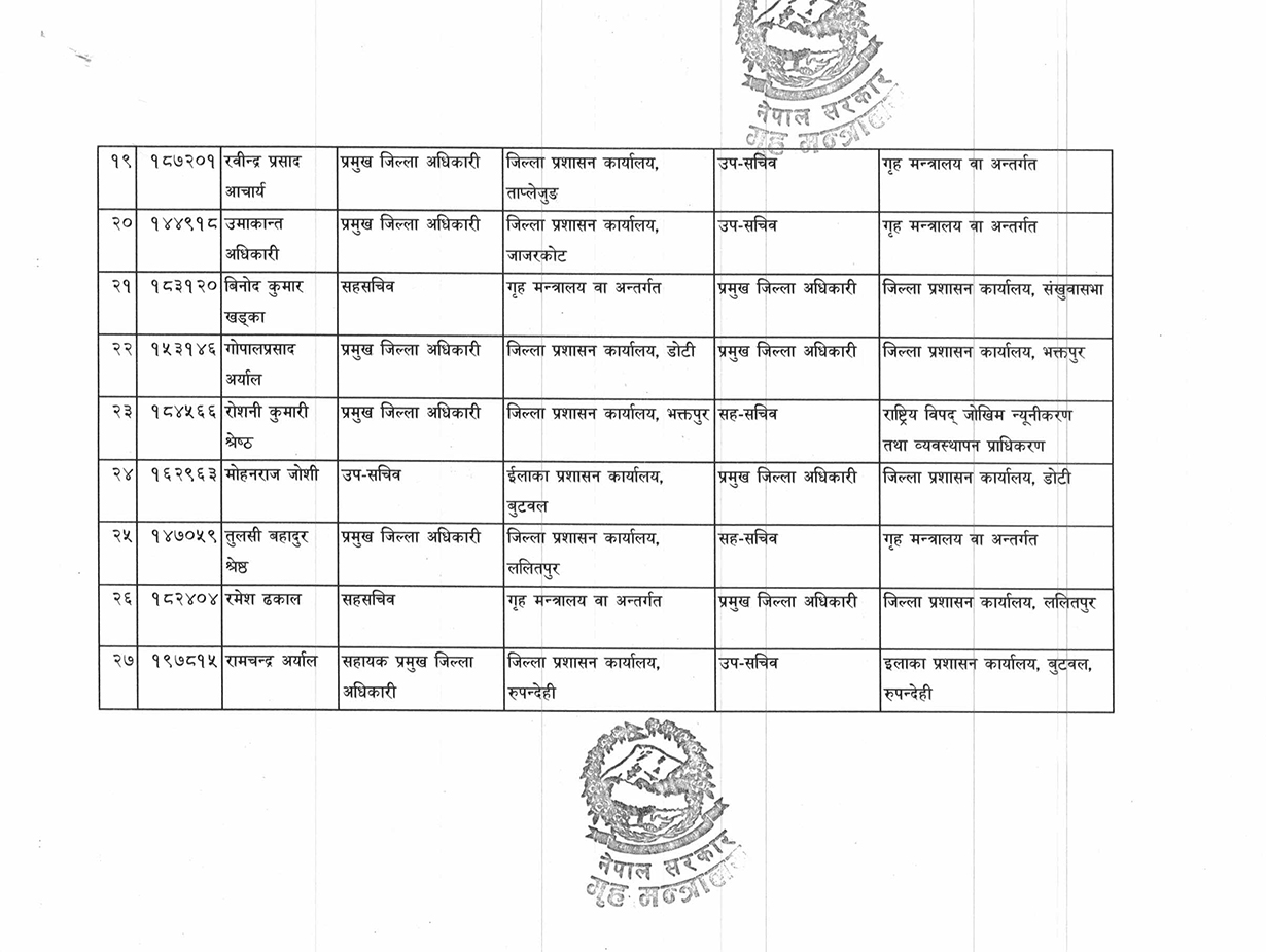 यस्तै टुकराज पोखरेलको धनकुटा, पुण्यविक्रम पौडेलको गोरखा, श्यामकृष्ण थापाको तनहुँ, जनार्दन गौतमको गुल्मी, भोला दाहालको सप्तरी, दीर्घराज उपाध्यायको बैतडी, मेखबहादुर मग्रातीको जाजरकोट, नेत्रप्रसाद शर्माको ताप्लेजुङ, विनादे खड्काको संखुवासभा र मोहनराज जोशीको डोटीको प्रमुख जिल्ला अधिकारीका रूपमा सरूवा भएको छ ।