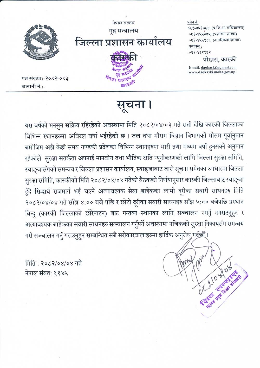 जिल्ला प्रशासन कार्यालय, कास्कीले मौसम पूर्वानुमान बमोजिम अझै केही समय गण्डकी प्रदेशका विभिन्न स्थानहरुमा भारी तथा मध्यम वर्षा हुनसक्ने अनुमान रहेकोले सुरक्षा सतर्कता अपनाई मानवीय तथा भौतिक क्षति न्यूनीकरणको लागि यस्तो निर्णय गरेको जानकारी दिएको छ । यो रोक कहिलेसम्म भन्ने बारे जिल्ला प्रशासन कार्यालय, कास्की जानकारी दिएको छैन ।