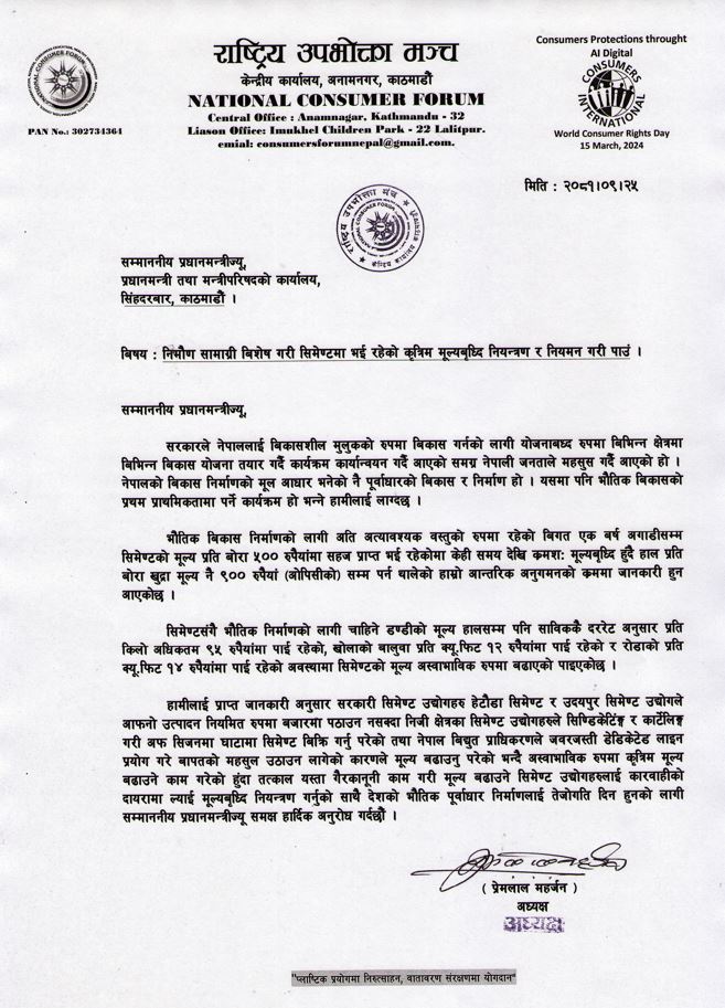 काठमाडौं । राष्ट्रिय उपभोक्ता मञ्चले सिमेन्टमा भइरहेको कृत्रिम मूल्यवृद्धि नियन्त्रण गर्न माग गर्दै प्रधानमन्त्री केपी शर्मा ओलीलाई पत्र पठाएको छ ।