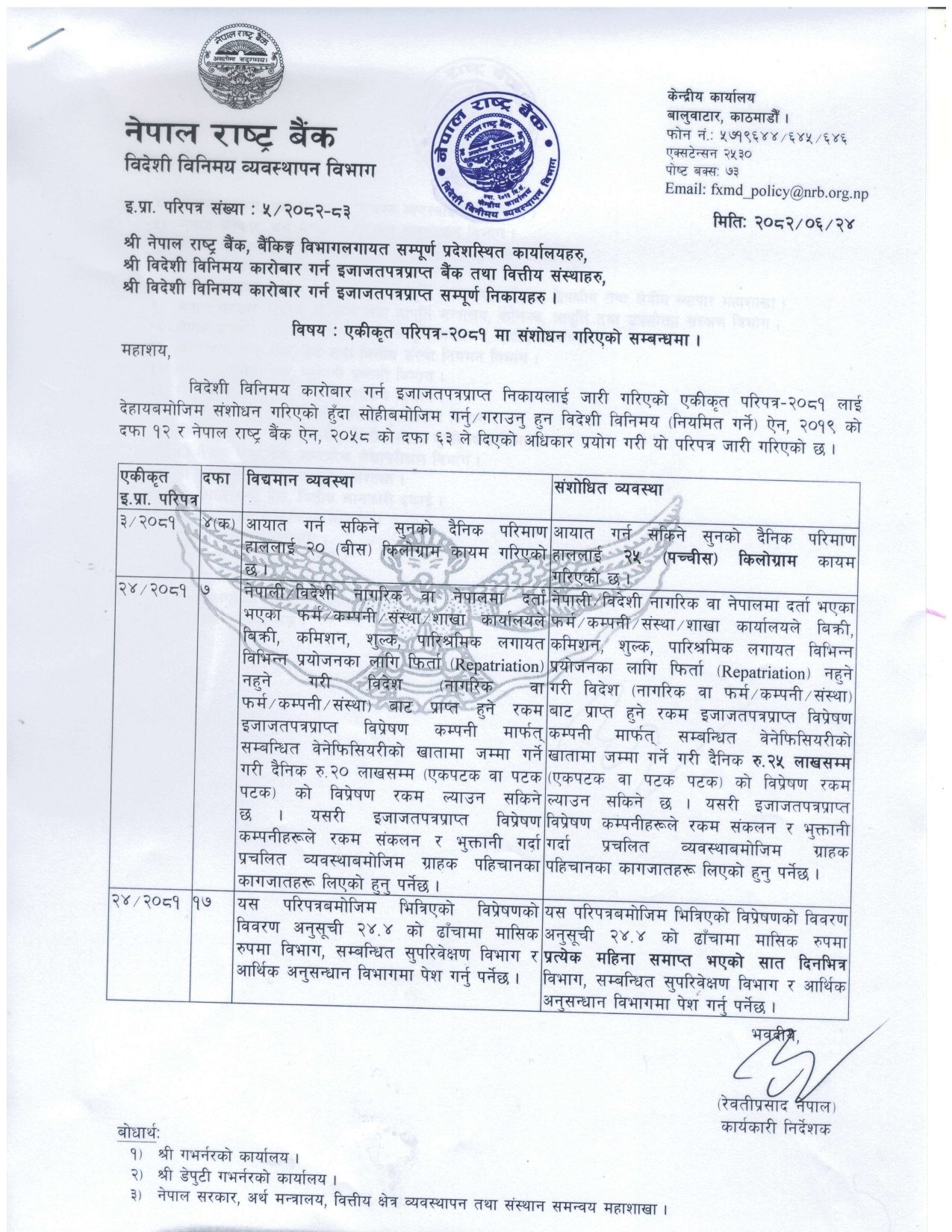 त्यस्तै,विदेशबाट आउने विप्रेषण (रेमिट्यान्स) को भुक्तानी सीमामा पनि परिवर्तन गरेको छ। विदेशी विनिमय व्यवस्थापन विभागले जारी गरेको नयाँ परिपत्रअनुसार यी व्यवस्था लागू हुने छ।