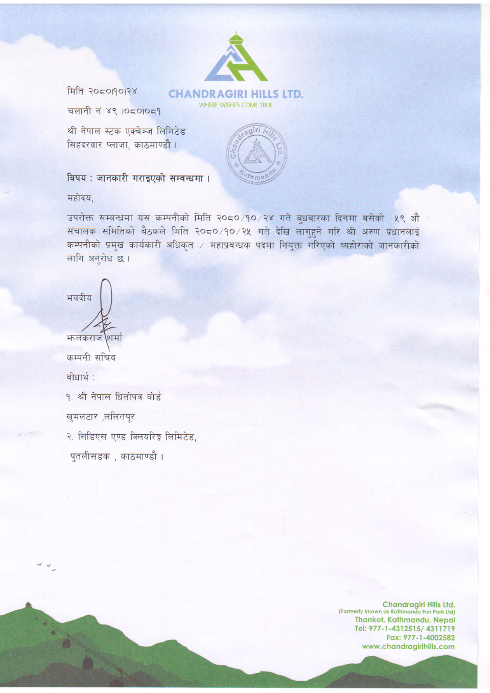 काठमाडौं । चन्द्रागिरी हिल्स लिमिटेडको प्रमुख कार्यकारी अधिकृमा अरुण प्रधान नियुक्त भएका छन् ।