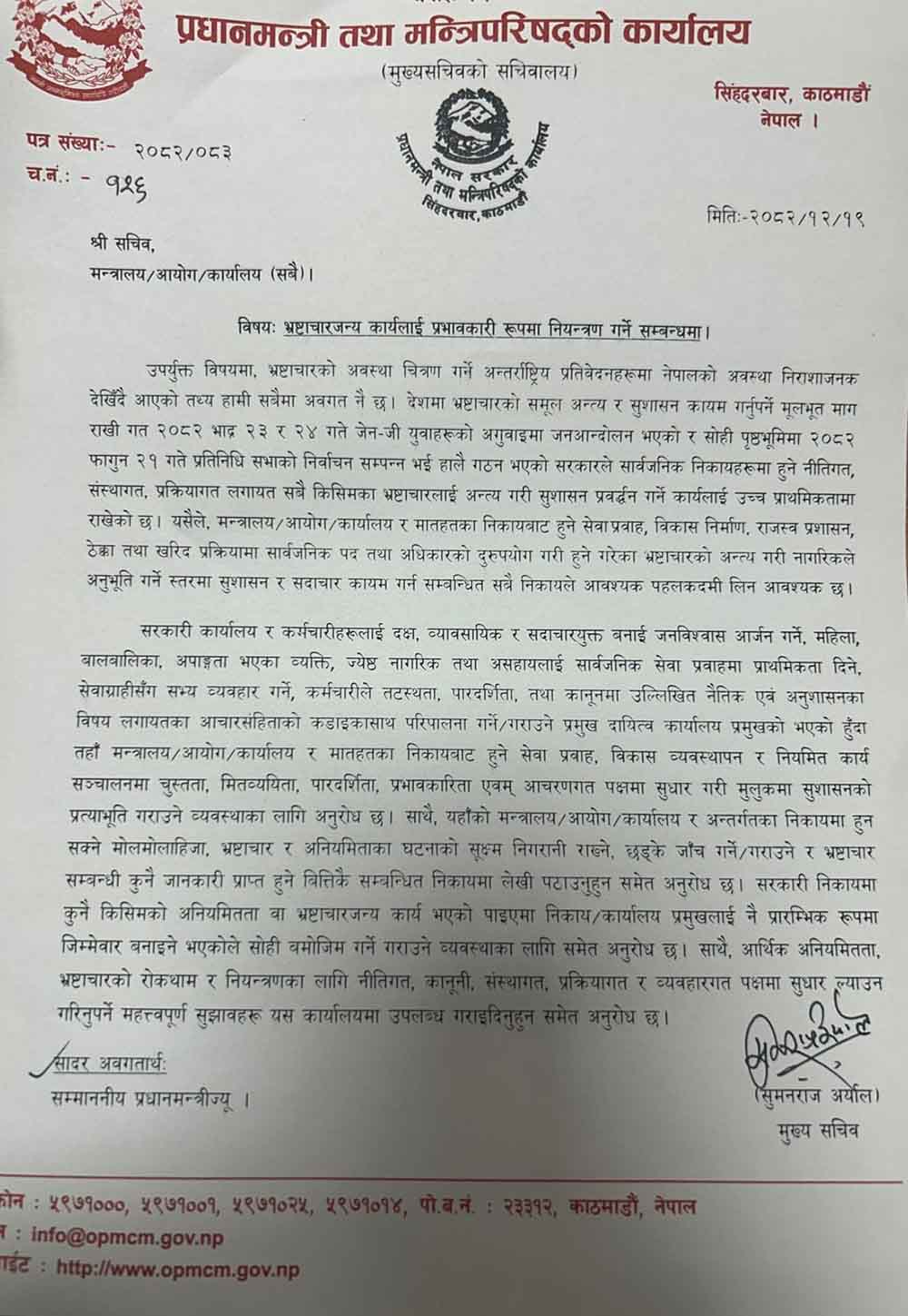 काठमाडौं । प्रधानमन्त्री तथा मन्त्रिपरिषद्को कार्यालय, सिंहदरबारले भ्रष्टाचार नियन्त्रणलाई प्रभावकारी बनाउन सबै मन्त्रालय, आयोग र सरकारी कार्यालयलाई कडाइका साथ निर्देशन दिएको छ ।