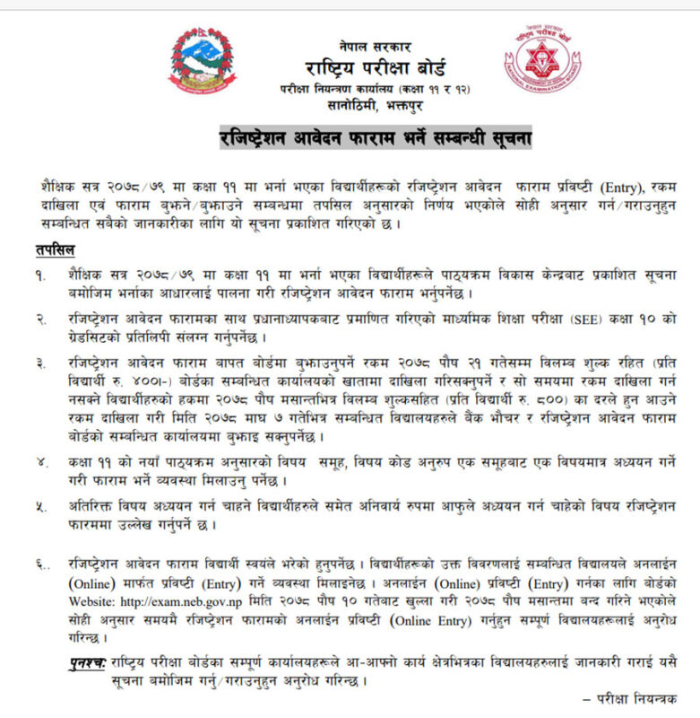 पोखरा मंसिर ७ ,राष्ट्रिय परीक्षा बोर्डले कक्षा ११ को रजिष्ट्रेशन आवेदन फारम खुला गरेको छ। शैक्षिक सत्र २०७८–७९ मा कक्षा ११ मा भर्ना भएका विद्यार्थीका लागि फाराम खुला गरिएको हो ।