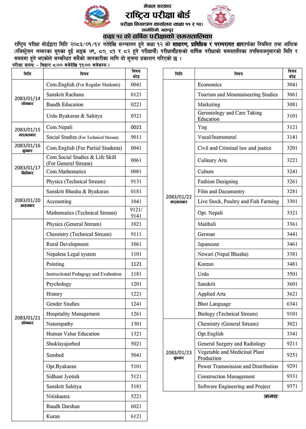 काठमाडौँ । कक्षा १२ को फाइनल परीक्षा बैशाख १४ गतेदेखि हुने भएको छ । राष्ट्रिय परीक्षा बोर्डले मंगलबार परीक्षा तालिका सार्वजनिक गरेको छ ।