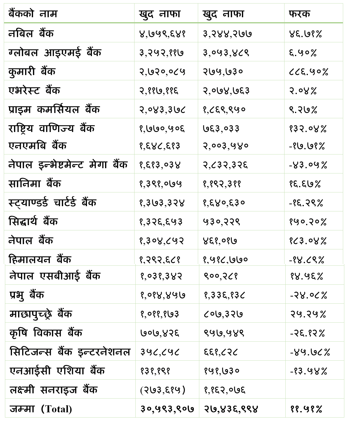 अर्थतन्त्रमा देखिएको सुस्तता, बढ्दो खराब कर्जा र कर्जा प्रवाहमा आएको संकुचनका बाबजुद बैंकहरूले आफ्नो नाफामा दोहोरो अंकको वृद्धि कायम राख्न सफल भएका हुन् । विवरण अनुसार २० वाणिज्य बैंकमध्ये ११ बैंकको नाफा बढेको छ । आठ बैंकको नाफा घट्दा एक बैंक भने नोक्सानमा रहेका छन् ।
