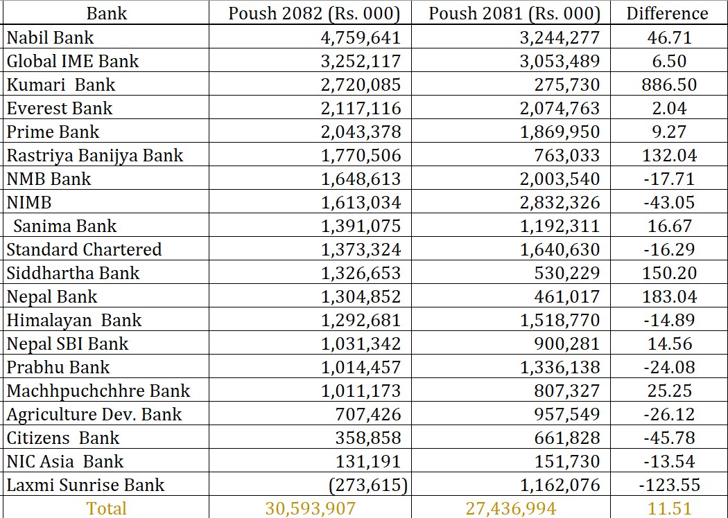 काठमाडौँ । वाणिज्य बैंकहरूको नाफा ११.५१ प्रतिशतले बढेको छ । बैंकहरूले चालू आर्थिक वर्ष २०८२/८३ को दोस्रो त्रैमासिकसम्मको वित्तीय विवरण अनुसार नाफामा यस्तो सुधार देखिएको हो ।