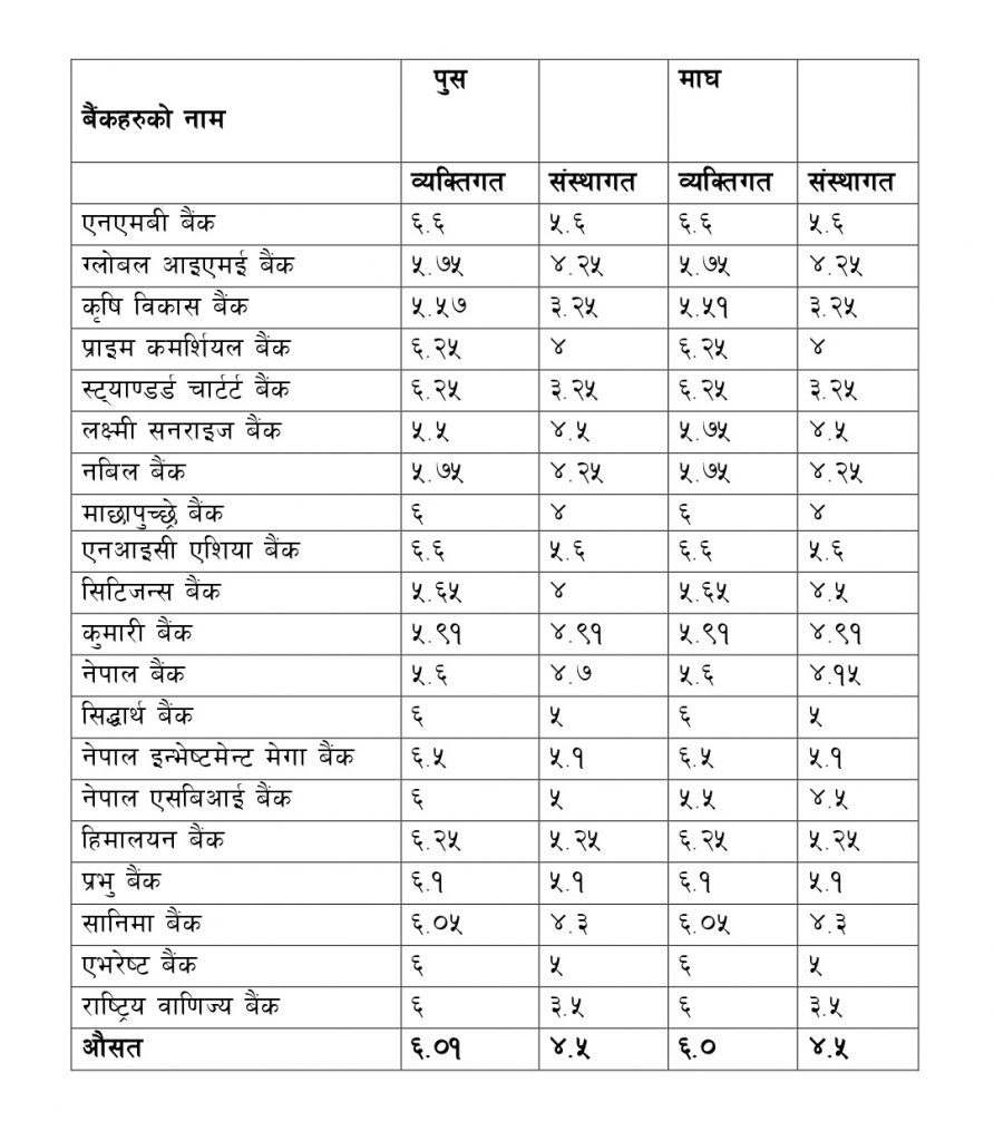 काठमाडाैं। माघ महिनाका लागि वाणिज्य बैंकहरुले नयाँ ब्याजदर सार्वजनिक गरेका छन् । माघ १ गतेदेखि लागू हुनेगरि सार्वजनिक गरिएको नयाँ ब्याजदर अनुसार अधिकांश वाणिज्य बैंकहरुले ब्याजदरलाई निरन्तरता दिएका छन् ।
