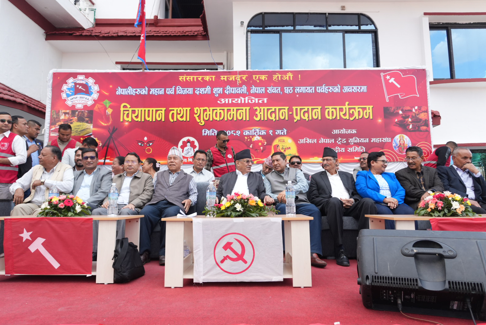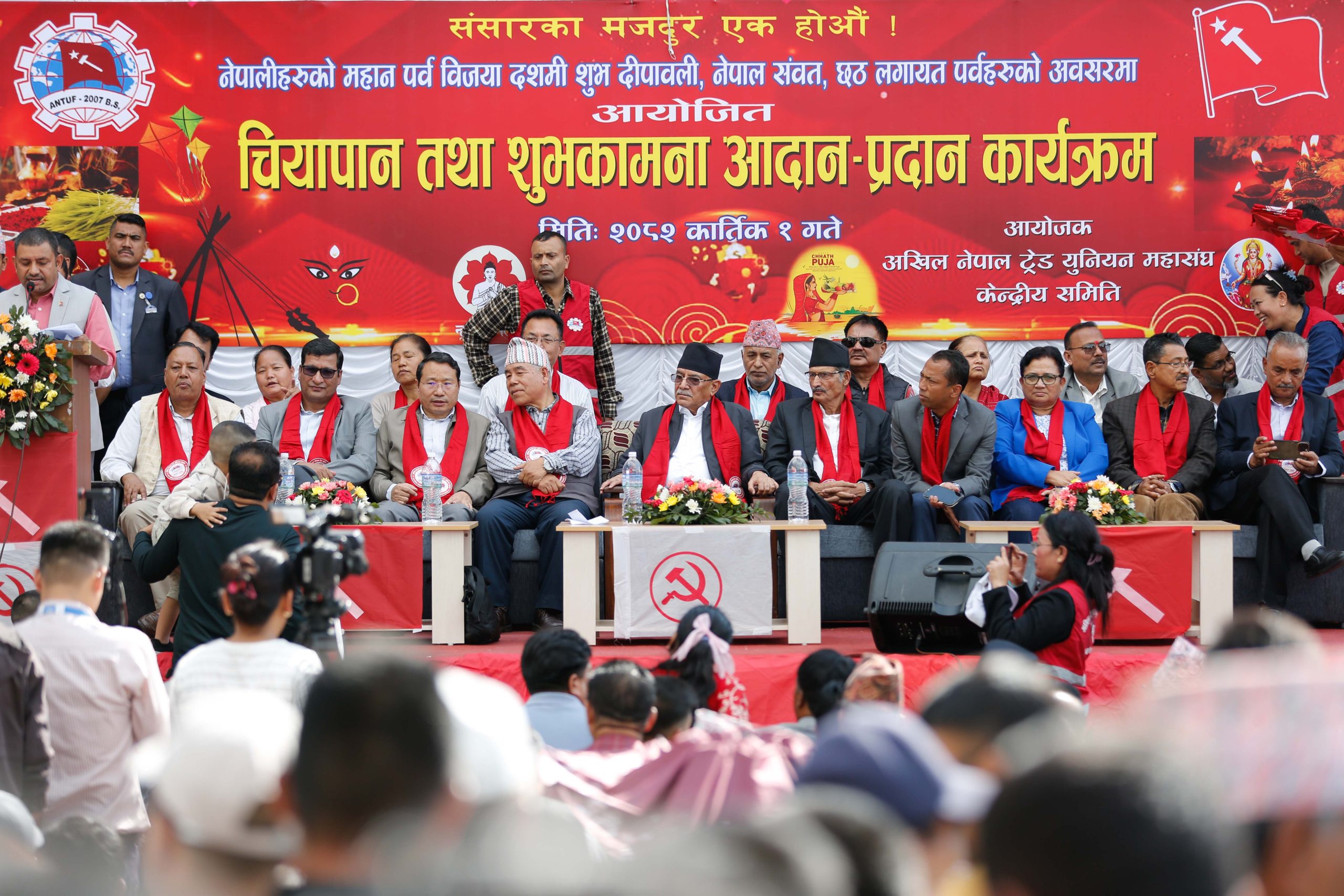काठमाडौं । अखिल नेपाल ट्रेड युनियन महासंघले नेकपा (माओवादी केन्द्र)को पार्टी कार्यालय पेरिसडाँडामा विजयदशमी, दीपावली, नेपाल संवत्, छठलगायत पर्वहरूका अवसरमा चियापान तथा शुभकामना कार्यक्रम आयोजना गरेको छ ।