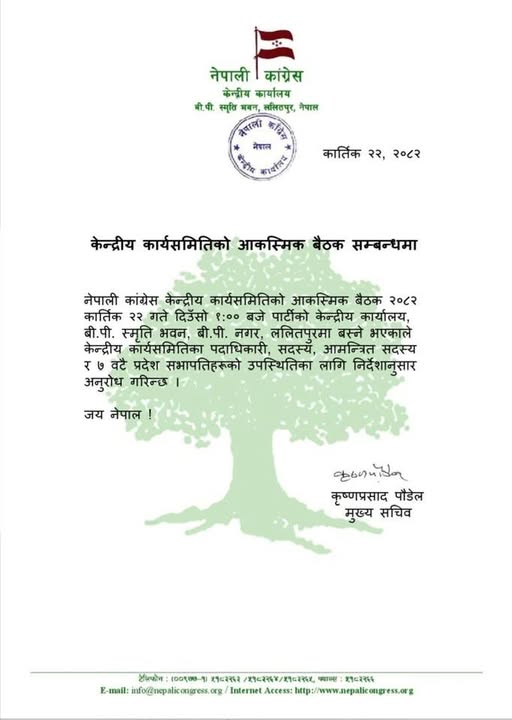 आज दिउसो १:०० बजे पार्टीको केन्द्रीय कार्यालय, बीपी स्मृति भवन ललितपुरमा बस्ने गरी बैठक बोलाइएको हो ।