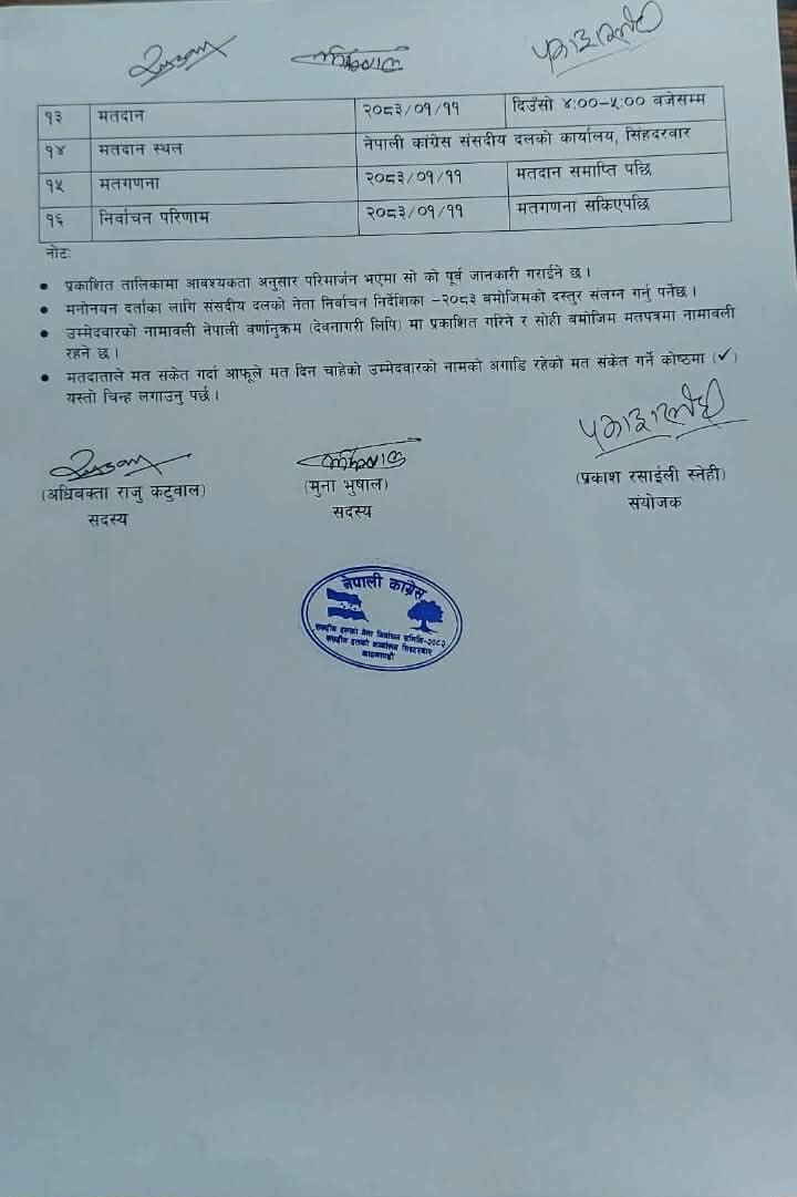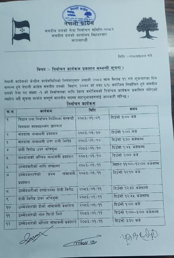 काठमाडौं । नेपाली कांग्रेसले वैशाख ११ गते संसदीय दल नेता चयन गर्ने गरी चुनावी कार्यतालिका प्रकाशन गरेको छ।