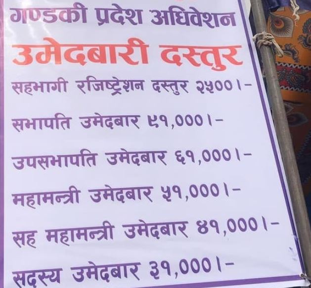 उम्मेदवार दस्तुरबारे जानकारी दिन टाँगिएको ब्यानरमा सभापति उम्मेदवारका लागि ९१ हजार शुल्क लाग्ने उल्लेख छ ।
