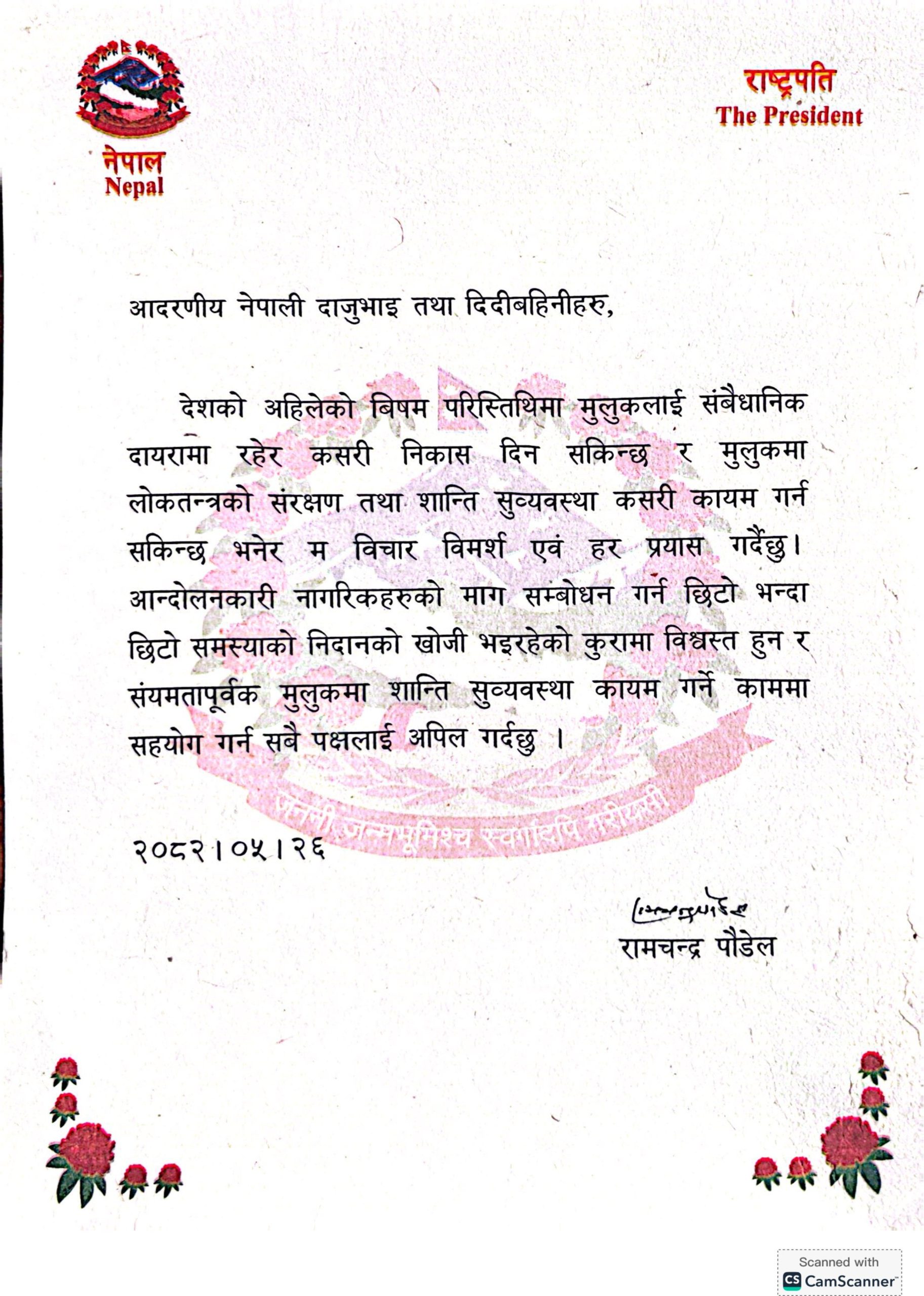 काठमाडौँ । राष्ट्रपति रामचन्द्र पौडेलले मुलुकको वर्तमान विषम परिस्थितिमा सबै पक्षलाई संयमता अपनाउन आग्रह गर्दै शान्ति र सुव्यवस्था कायम गर्न सहयोगको लागि अपिल गरेका छन् ।