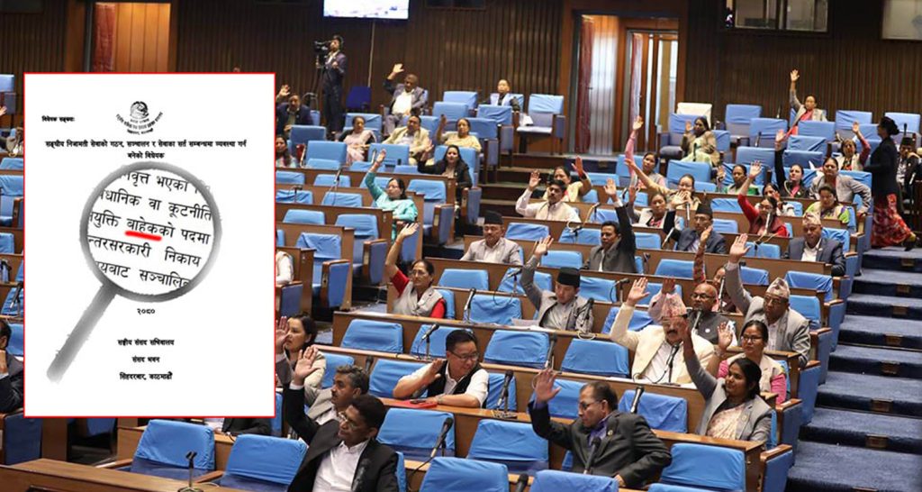 काठमाडौं । प्रतिनिधि सभाले आइतबार सङ्घीय निजामती सेवा विधेयक पारित भएपछि फेरि चर्चामा रहेको छ ।यो विधेयक पारित भएपछि बहुचर्चित ‘कुलिङ पिरियड’ मा कर्मचारीहरूले चलखेल गरेको खुलासा भएपछि यो विषय चर्चामा रहेको छ ।प्रतिनिधि सभाको राज्य व्यवस्था तथा सुशासन समितिले पारित गरेर सरकारले संसदमा पेश गरेको विधेयकमा पारित भएर आउँदा अर्कै अर्थ लाग्नेगरी थपिएको खुलेको … Continue reading ‘कुलिङ पिरियड’ मा कर्मचारीको सर्जिकल स्ट्राइक !