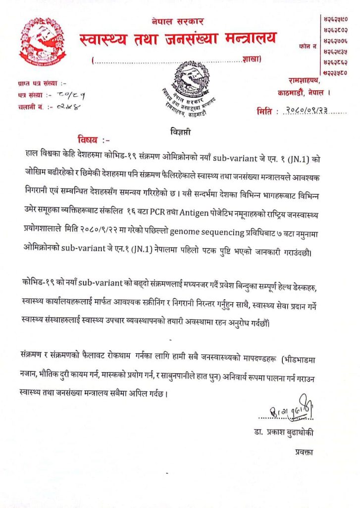 मन्त्रालयले एक विज्ञप्ति जारी गर्दै नयाँ सब–भेरियन्ट जेएन.१ फेला परेकाले सतर्क रहन सर्वसाधारणमा अनुरोध गरेको छ । नयाँ भेरियन्टको संक्रमण फैलन नदिन भीडमा नजान, भौतिक दूरी कायम गर्न, मास्कको प्रयोग गर्न र साबुनपानीले हात धुन मन्त्रालयले आग्रह गरेको छ ।