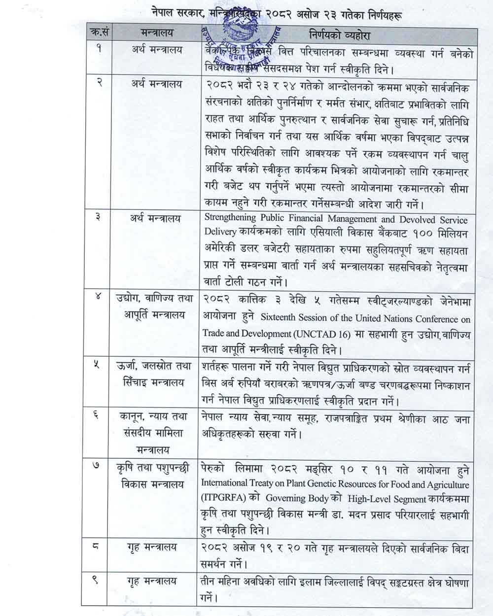 काठमाडौं । असोज २३ गते बसेको मन्त्रिपरिषद्को बैठकका २० निर्णयहरु सार्बजनिक गरिएको छ ।