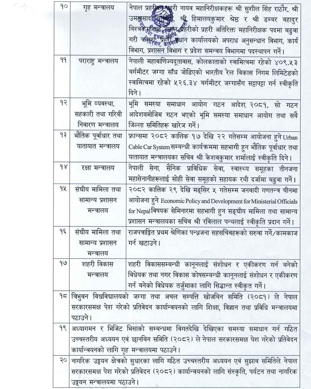 मन्त्रिपरिषद्को बैठकले भूमि समस्या समाधान आयोग र सबै जिल्ला समिति खारेज गर्ने निर्णय गरेको छ भने इलाम जिल्लालाई तीन महिनाका लागि विपदग्रस्त जिल्ला घोषणासहितका विभिन्न निर्णयहरु गरेको छ ।