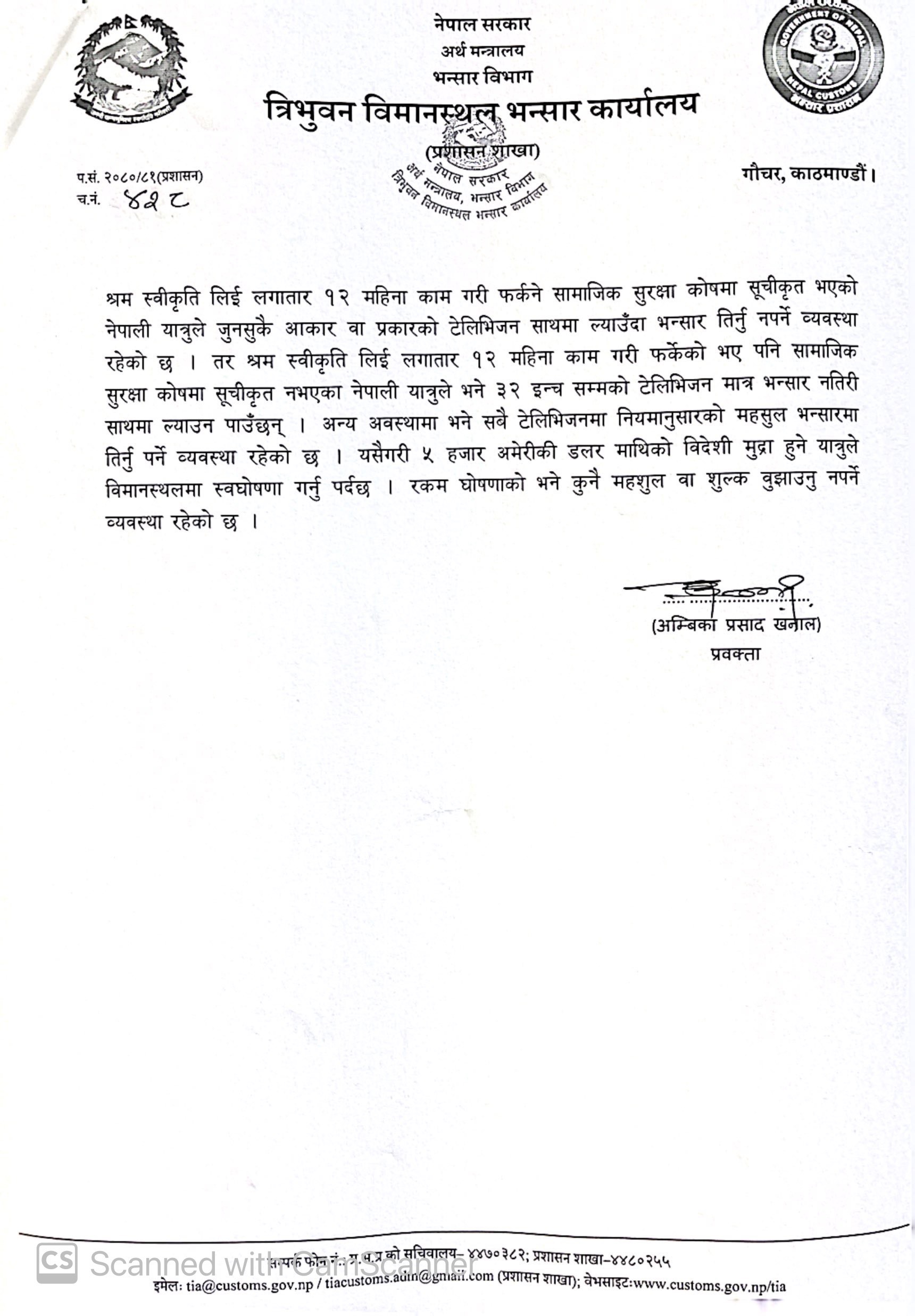 श्रम स्वीकृति लिएर लगातार १२ महिना काम गरेको र सामाजिक सुरक्षा कोषमा सुचिकृत भएका नेपाली यात्रुले जुनसुकै आकार वा प्रकारको टेलिभिजन ल्याउँदा भन्सार तिर्नुपर्ने छैन ।