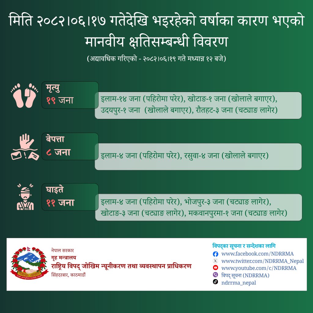 राष्ट्रिय विपद् जोखिम न्यूनीकरण तथा व्यवस्थापन प्राधिकरणको तथ्याङ्क अनुसार आज मध्यान्न १२ बजेसम्म इलाममा पहिरोमा परी १४ जना, खोटाङ र उदयपुरमा खोलाले बगाएर ११ जना र रौतहटमा चट्याङ लागेर ३ जनाको मृत्यु भएको हो ।