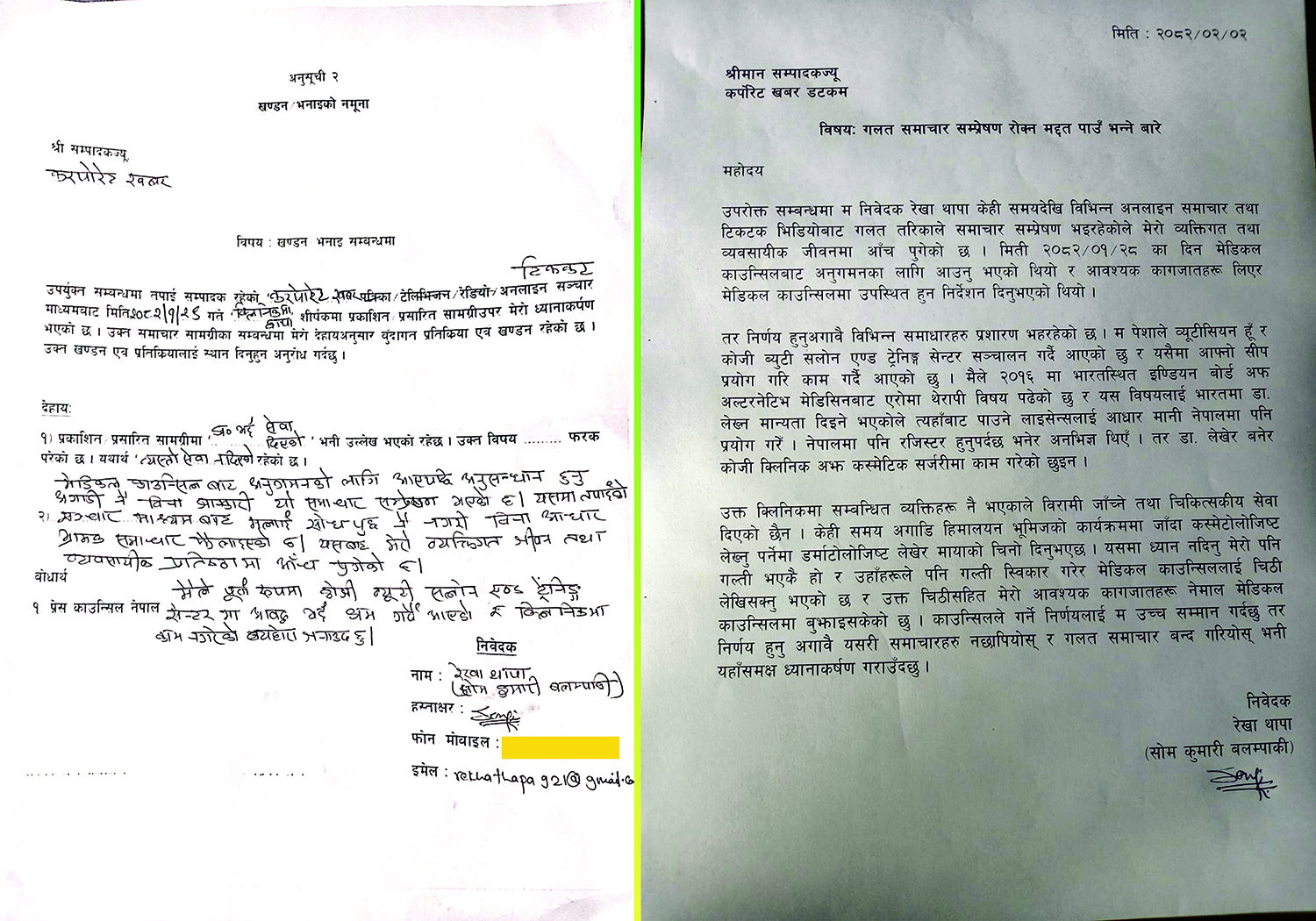यस्तै, उनले नेपाल मेडिकल काउन्सिल नेतृत्वको टोलीले आफ्नो ब्युटीपार्लरमा अनुगमन गर्नुअगावै समाचार सम्प्रेषण गरी व्यक्तिगत जीवन तथा व्यावसायिक प्रतिष्ठामा आँच पुर्याएको दाबी पनि गरेकी छिन् । ‘मेडिकल काउन्सिलबाट अनुगमनका लागि आएपछि अनुसन्धान हुनुअगाडि नै बिनाजानकारी यो समाचार सम्प्रेषण भएको छ । यसमा तपाइँको सञ्चार माध्यमबाट मलाई सोधपुछ नै नगरी बिना आधार भ्रामक समाचार फैलाइएको छ,’ उनले भनेकी छिन्, ‘यसबाट मेरो व्यक्तिगत जीवन तथा व्यावसायिक प्रतिष्ठामा आँच पुगेको छ ।’