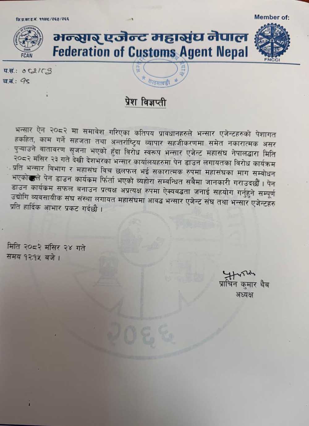 महासंघका अध्यक्ष प्राचिन कुअमर थैवले देशभरका भन्सार कार्यालयहरुमा पेन डाउन लगायतका विरोध कार्यक्रमप्रति भन्सार विभाग र महासंघबीच छलफल भई सकारात्मक रुपमा महासंघका माग सम्बोधन भएकोले पेन डाउन कार्यक्रम फिर्ता भएको जनाकारी दिएका छन् ।