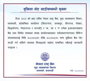साथै इजाजत पत्र प्राप्त बैंक तथा वित्तीय संस्थाका शाखा कार्यालयहरूबाट पनि सुकिलो नोट सटही गर्ने व्यवस्था मिलाइएको राष्ट्र बैंकले जनाएको छ।