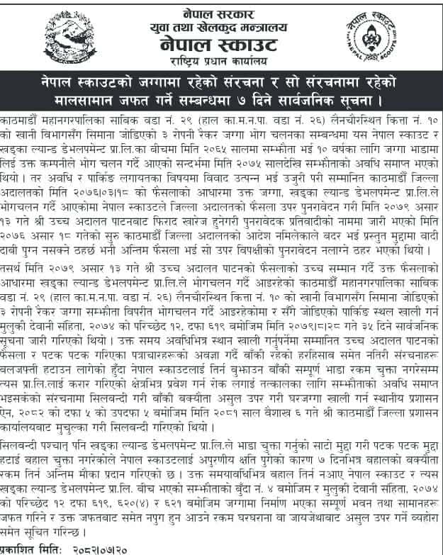 विहिबार सूचना जारी गदै नेपाल स्काउटले खड्का ल्यान्ड डेभलपमेन्ट प्रालिलाई ७ दिनभित्र बहालको बक्यौता रकम तिर्न अन्तिम मौका दिएको जनाएको छ ।
