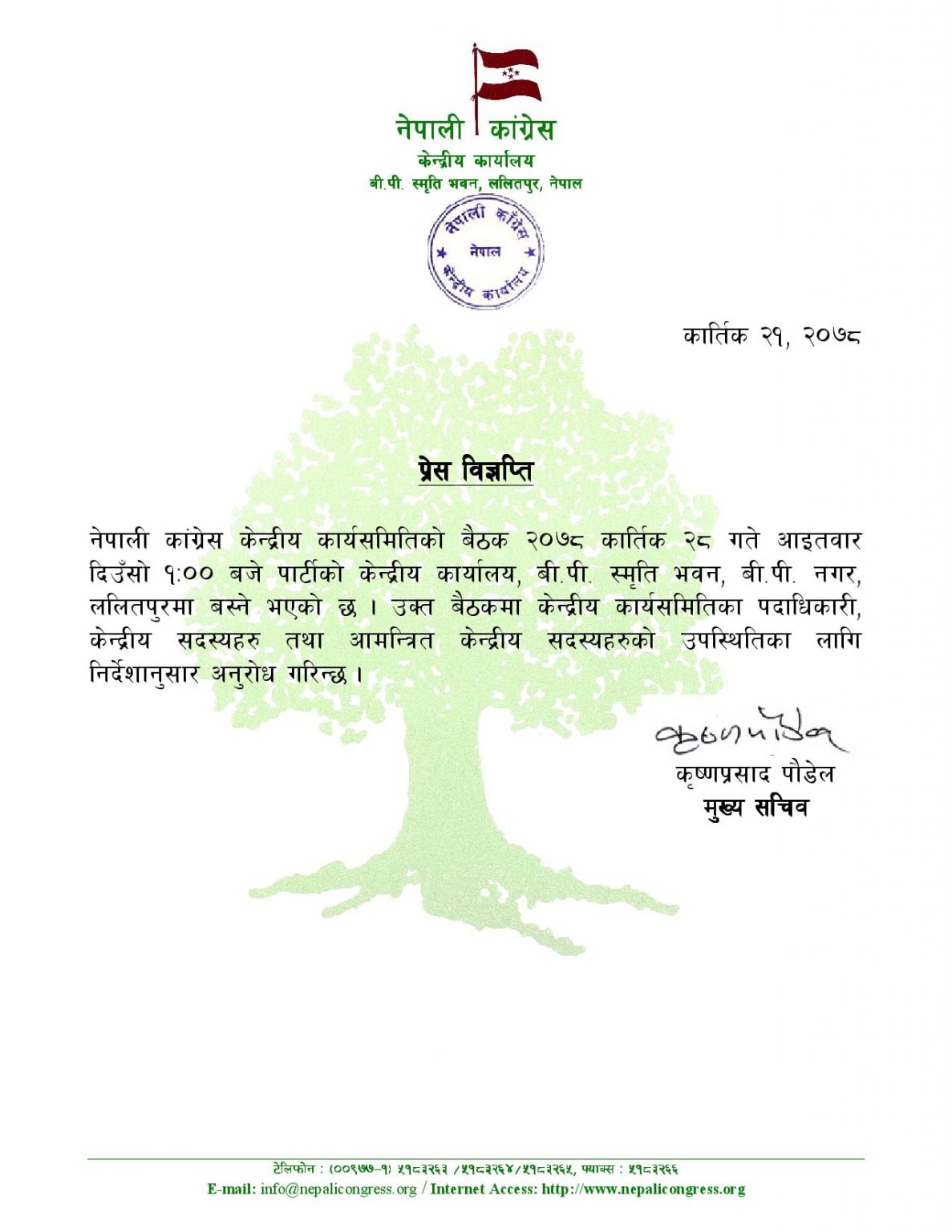 काठमाडौं । नेपाली कांग्रेसको केन्द्रीय समिति बैठक कात्तिक २८ गते बस्ने भएको छ ।
