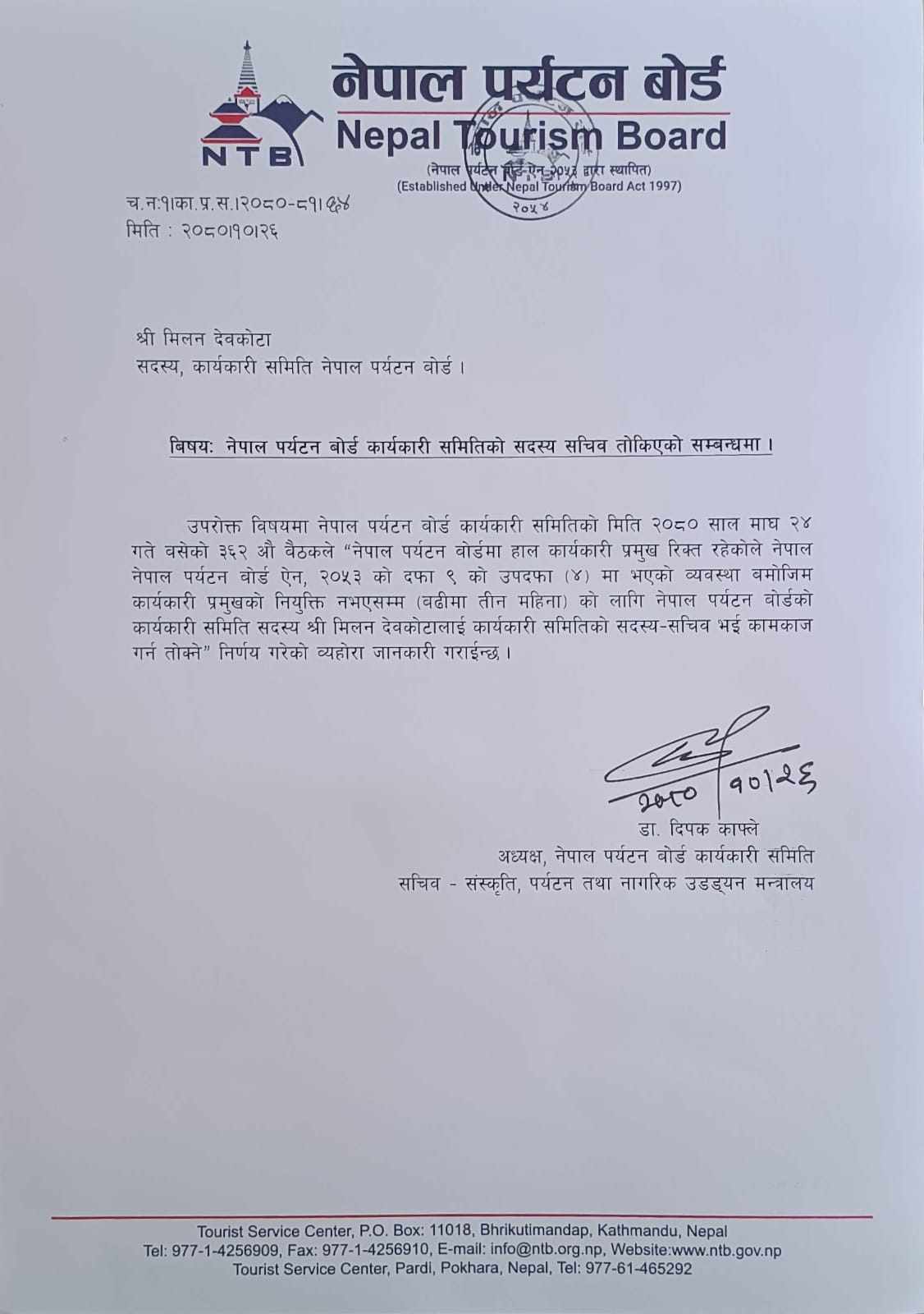 काठमाडौँ । नेपाल पर्यटन बोर्डको कार्यकारी समितिको सदस्य सचिवमा मिलन देवकोटा नियुक्त भएकी छिन् ।