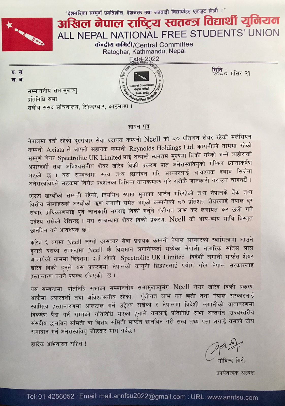 आज बिहीबार अखिल नेपाल राष्ट्रिय स्वतन्त्र विद्यार्थी युनियन (अनेरास्वबियु)ले एनसेलको विषयमा बुझाएको ज्ञापनपत्र ग्रहण गर्दै उनले अनुसन्धान आवश्यक रहेको बताएका हुन् ।