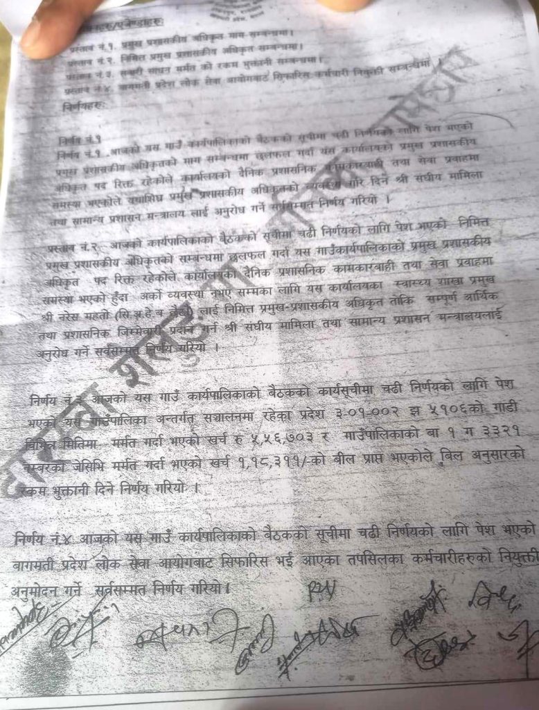 तर कार्यपालिका बैठकबाट अध्यक्ष मोक्तानले क्षति पुर्याएको गाडी मर्मतको लागि ५ लाख ५६ हजार ६ सय ३ रुपैँया दिने निर्णय गराएका थिए । अध्यक्ष मोक्तानले क्षति पुर्याए गाउँपालिकाको प्रदेश ३–०१, ००२ झ ५१०६ नं को गाडी सरकारी कोषबाट मर्मत गरिएको भन्दै विरोध भएपछि सो कार्य नेकपा एमालेका नेता तुलप्रसाद कँडेल र अनेरास्ववियुका केन्द्रीय सदस्य तिलक घतानीको अगुवाइमा भएको भन्दै मोक्तानले शनिबार गाउँमा नै आयोजित एउटा महिला सहकारीको साधारण सभामा धम्कीपूर्ण अभिव्यक्ति दिएका छन् ।