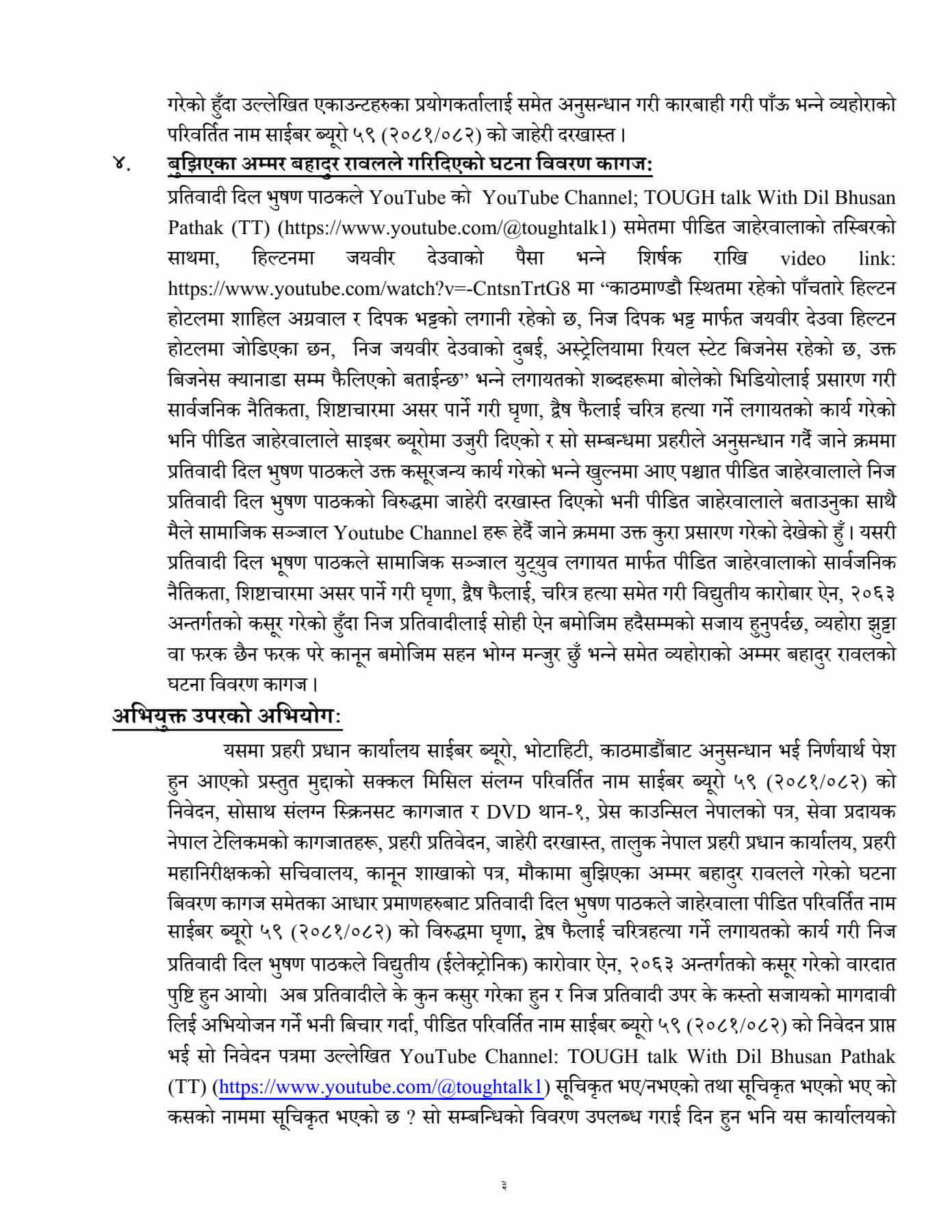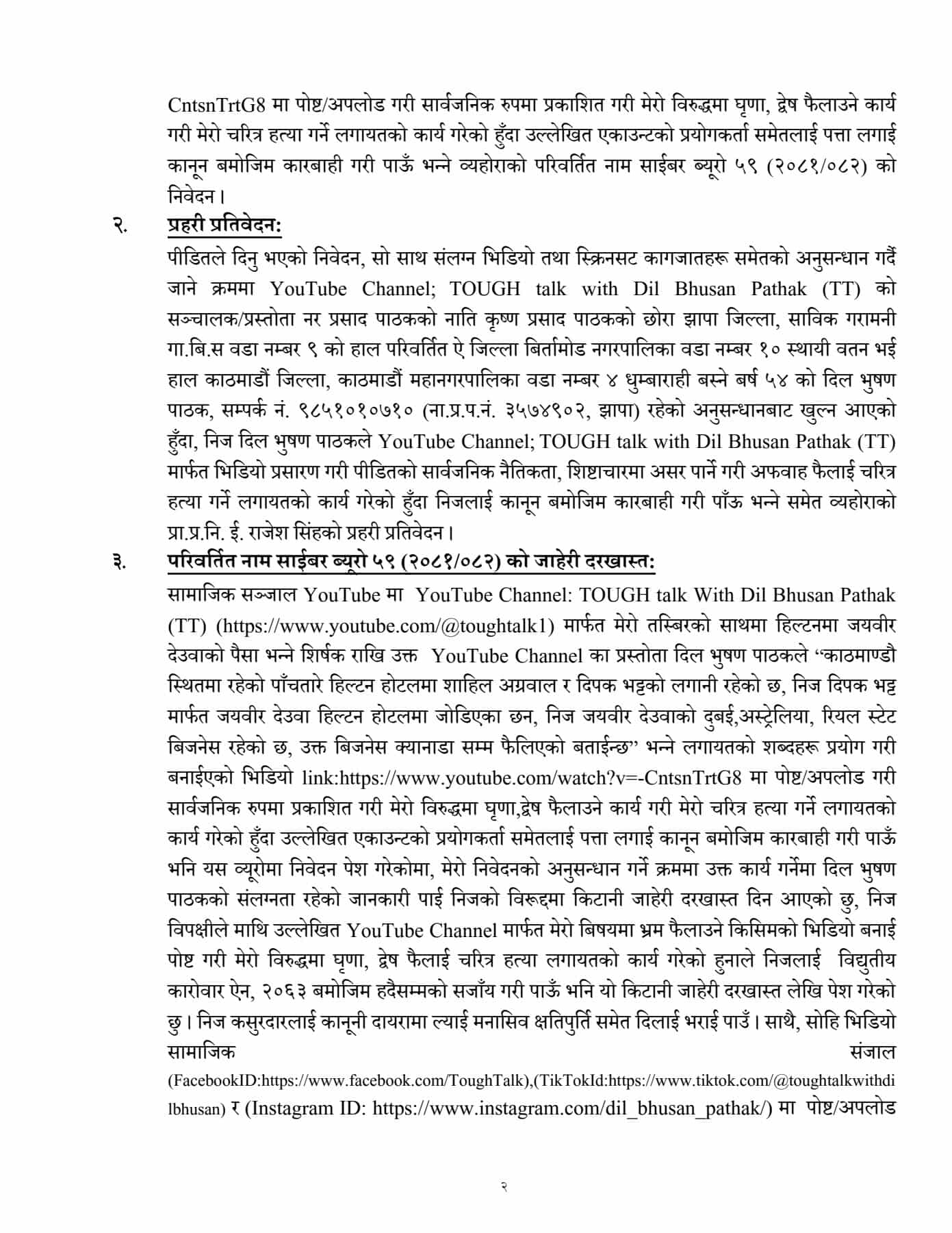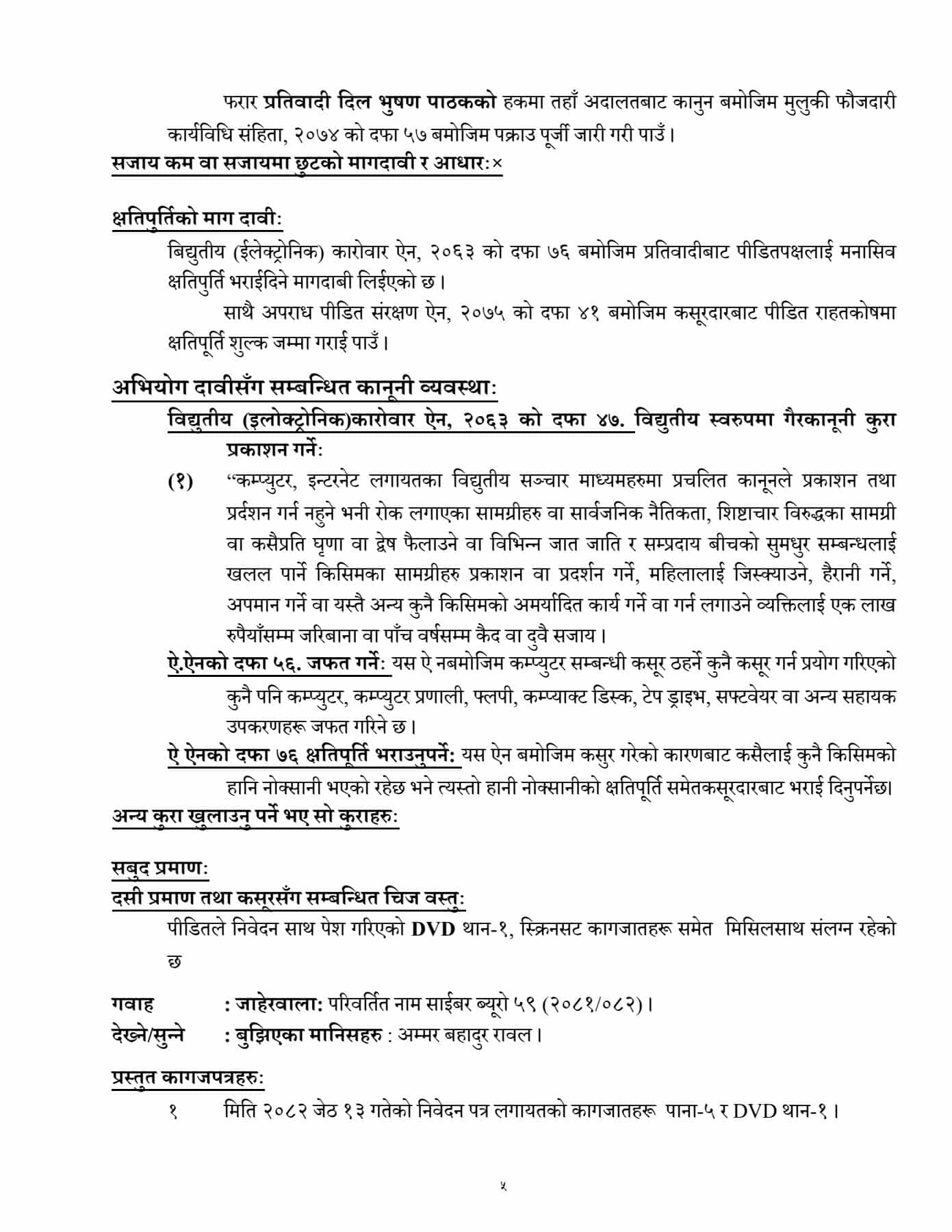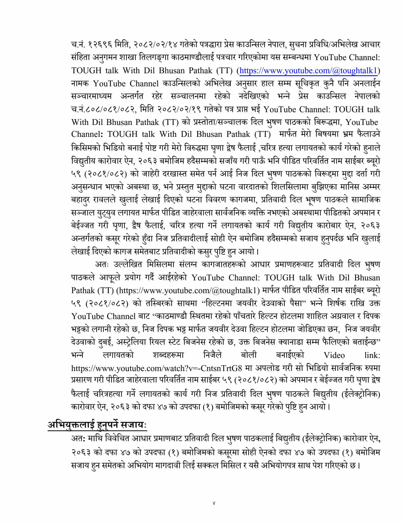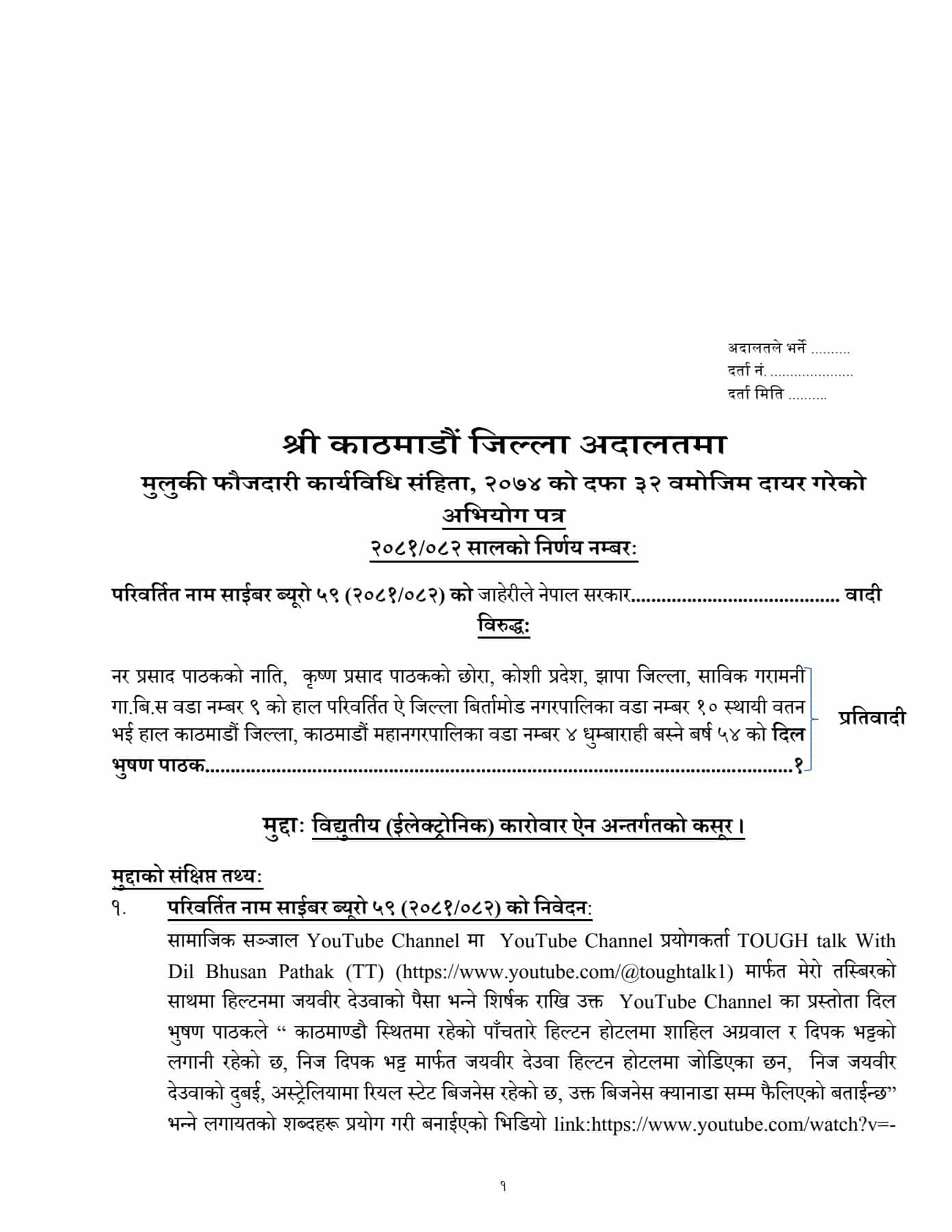 काठमाडौं । साइबर अपराध गरेको आरोपमा पत्रकार दिलभूषण पाठकविरुद्ध काठमाडौं जिल्ला अदालतमा मुद्दा दायर भएको छ ।