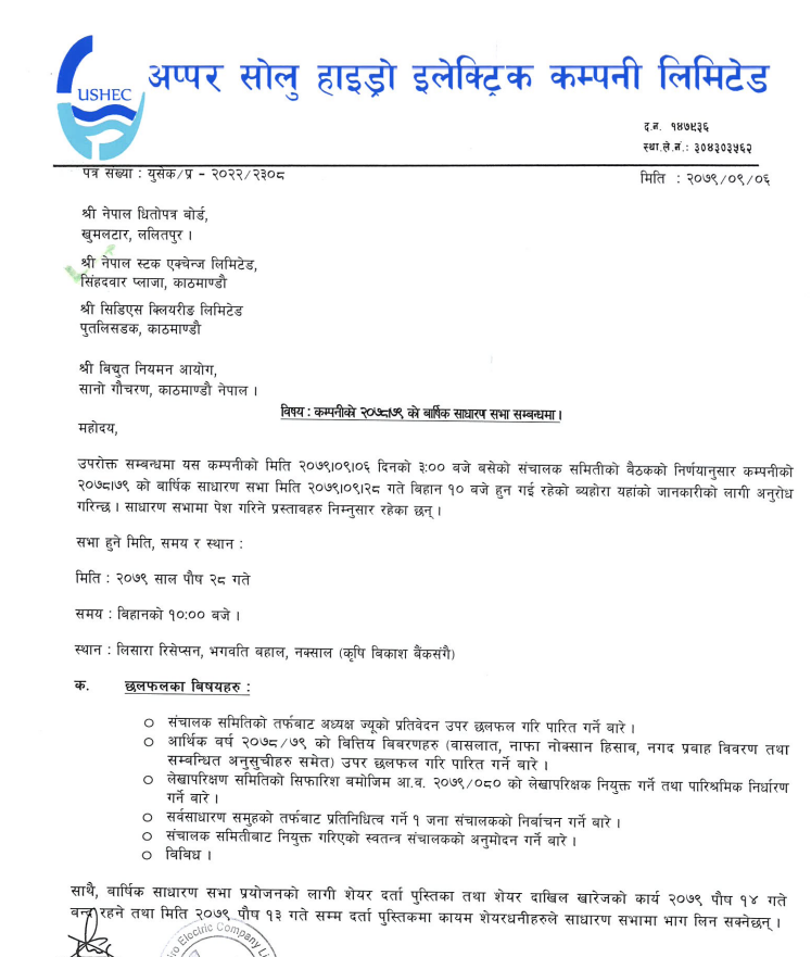 काठमाडौं । अपर सोलु हाईड्रो इलेक्ट्रिक कम्पनीले लाभांश नदिने भएको छ ।