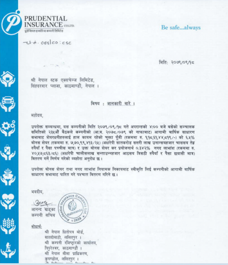 काठमाडौं । प्रुडेन्सियल इन्स्योरेन्सले शेयरधनीलाई लाभांश दिने घोषणा गरेको छ ।