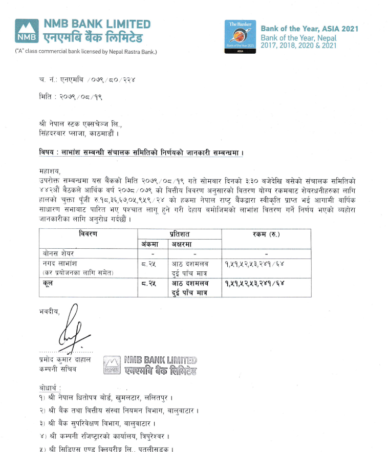 उक्त प्रस्तावित लाभांश नेपाल राष्ट्र बैंकबाट स्विकृत भएर बैंकको वार्षिक साधारण सभाले पारित गरेपछि वितरण गरिनेछ ।