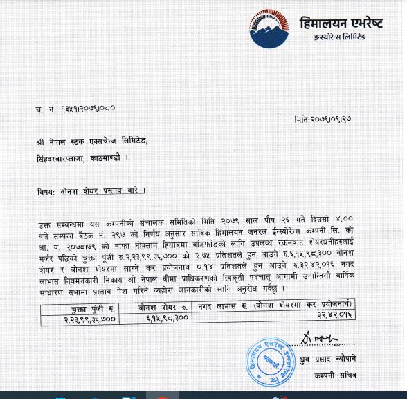 कम्पनीले २.७५ प्रतिशत बोनस सेयर र कर प्रयोजनका लागि ०.१४ प्रतिशत नगद दिने प्रस्ताव गरेको हो । यो प्रस्ताव नेपाल बीमा प्राधिकरणबाट स्वीकृति भएर कम्पनीको आगामी साधारण सभाले पारित गरेपछि सेयरधनीले पाउनेछन् ।