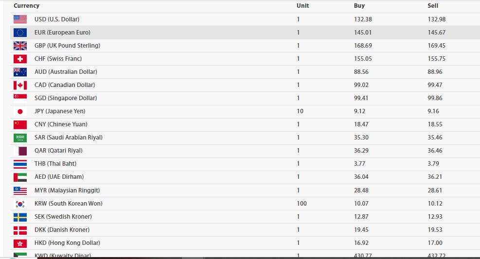 अमेरिकी डलर एकको खरिद दर १३२ रुपैयाँ ३८ पैसा बिक्री दर १३२ रुपैयाँ ९८ पैसा रहेको छ । युरो एकको खरिद दर १४५ रुपैयाँ १ पैसा बिक्री दर १४५ रुपैयाँ ६७ पैसा रहेको छ।