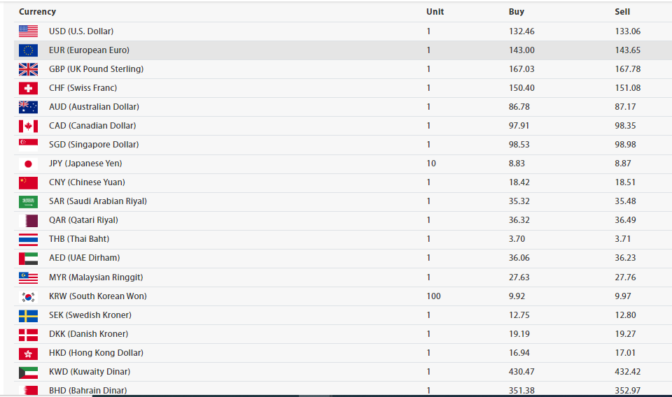 अमेरिकी डलर एकको खरिद दर १३२ रुपैयाँ ४६ पैसा बिक्री दर १३३ रुपैयाँ ६ पैसा रहेको छ । युरो एकको खरिद दर १४३ रुपैयाँ बिक्री दर १४३ रुपैयाँ ६५ पैसा रहेको छ।
