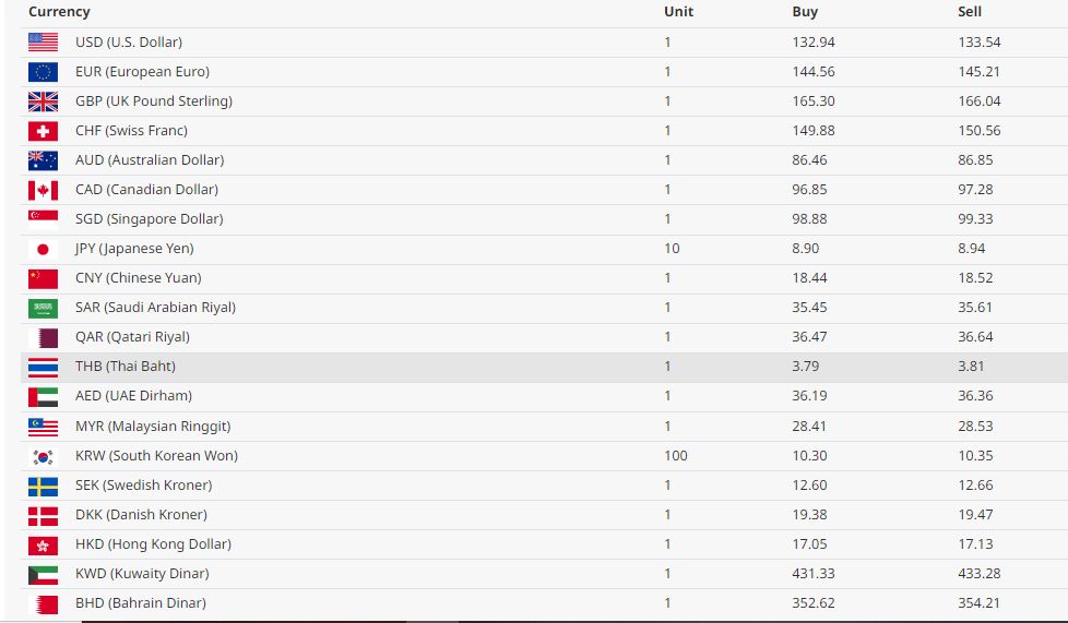 आज अमेरिकी डलर एकको खरिद दर १३२ रुपैयाँ ९४ पैसा बिक्री दर १३३ रुपैयाँ ५४ पैसा रहेको छ । युरो एकको खरिद दर १४४ रुपैयाँ पैसा बिक्री दर १४५ रुपैयाँ २१ पैसा रहेको छ।