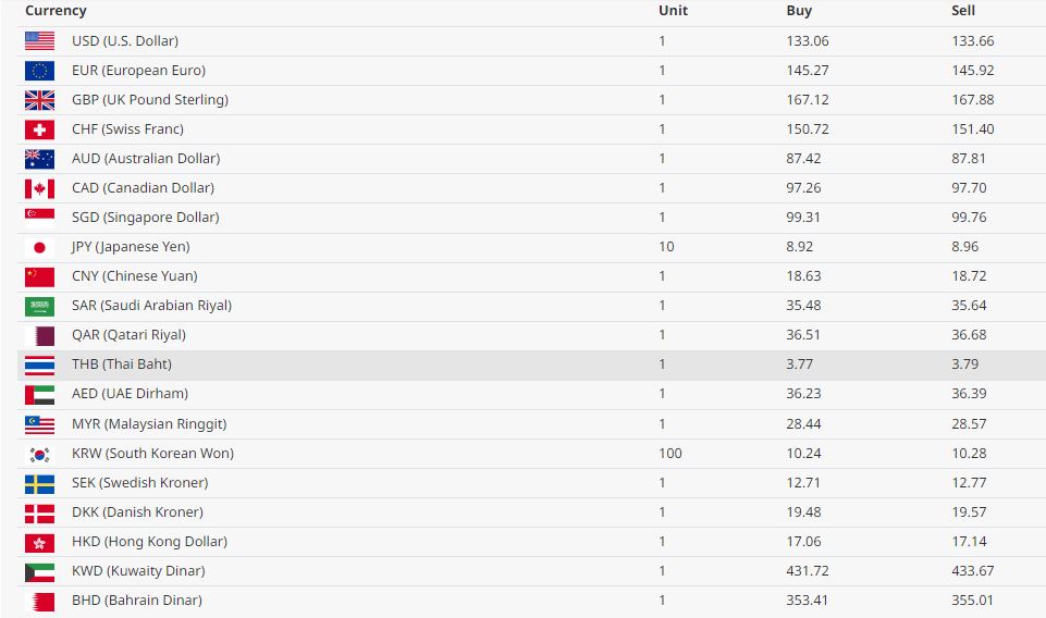 अमेरिकी डलर एकको खरिद दर १३३ रुपैयाँ ०६ पैसा बिक्री दर १३३ रुपैयाँ ६६ पैसा छ । युरो एकको खरिद दर १४५ रुपैयाँ २७ पैसा बिक्री दर १४५ रुपैयाँ ९२ पैसा रहेको छ।