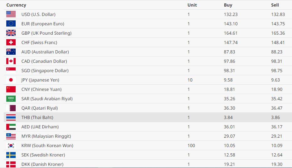 डलरको खरिद दर १३२ रूपैयाँ २३ पैसा र बिक्री दर १३२ रूपैयाँ ८३ पैसा रहेको छ । युरो एकको खरिद दर १४३ रूपैयाँ १० पैसा र बिक्री दर १४३ रूपैयाँ ७५ पैसा रहेको छ।