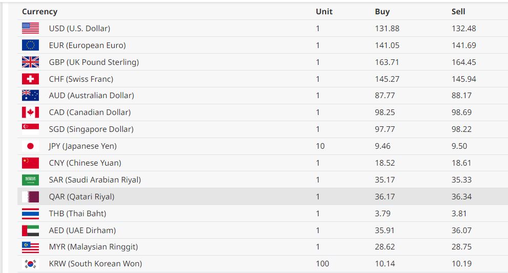 बेलायती पाउण्ड एकको खरिद दर १६३ रूपैयाँ ७१ पैसा र बिक्री दर १६४ रूपैयाँ ४५ पैसा रहेको छ । कतारी रियालको मूल्य एकको खरिद दर ३६ रूपैयाँ १७ पैसा बिक्री दर ३६ रूपैयाँ ३४ पैसा रहेको छ ।