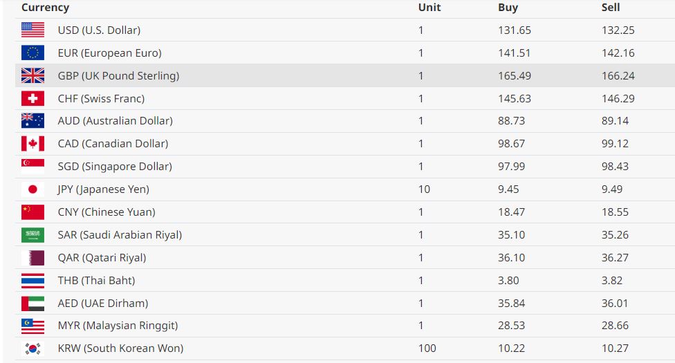 बेलायती पाउन्ड स्टर्लिङ एकको खरिद दर १६५.४९ रुपैयाँ बिक्री दर १६६.२४ रुपैयाँ रहेको छ । अस्ट्रेलियन डलर एकको खरिद दर ८८.७३ रुपैयाँ बिक्री दर ८९.१४ रुपैयाँ रहेको छ ।