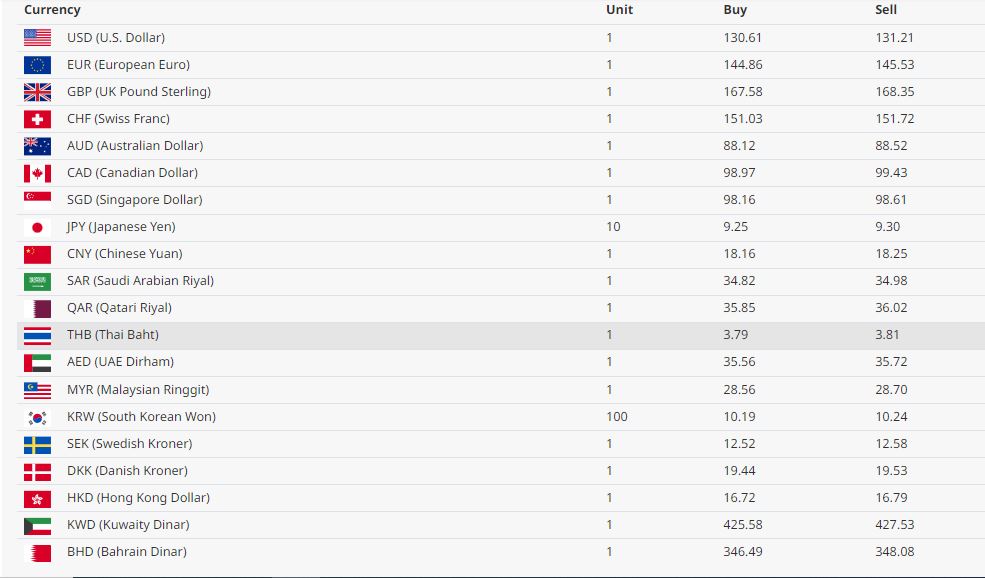 आज डलर एकको खरिद दर १३० रूपैयाँ ६१ पैसा बिक्री दर १३१ रूपैयाँ २१ पैसा रहेको छ । युरो एकको खरिद दर १४४ रूपैयाँ ८६ पैसा बिक्री दर १४५ रूपैयाँ ५३ पैसा रहेको छ।