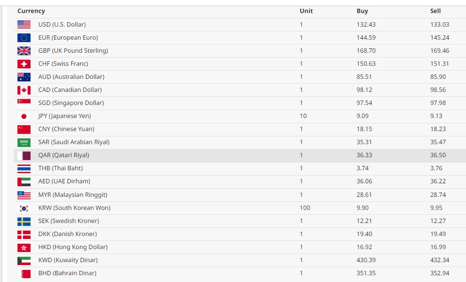 बेलायती पाउण्ड एकको खरिद दर १६८ रूपैयाँ ७० पैसा बिक्री दर १६९ रूपैयाँ ४६ पैसा रहेको छ। कतारी रियालको मूल्य एकको खरिद दर ३६ रूपैयाँ ३३ पैसा बिक्री दर ३६ रूपैयाँ ५० पैसा रहेको छ ।