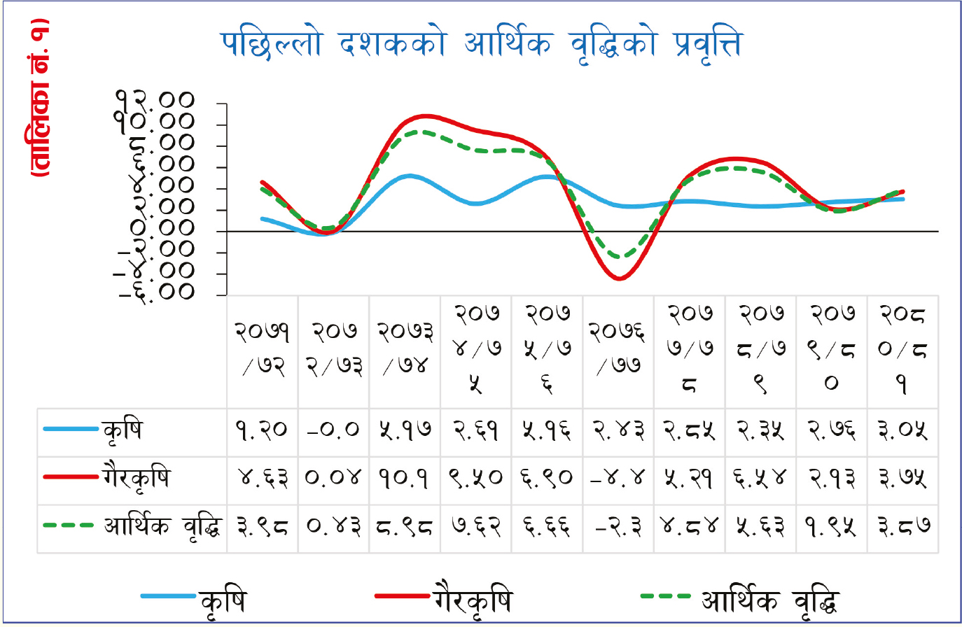 यो १० वर्षमा मुलुकको वार्षिक औसत आर्थिक वृद्धिदर ४.१६ प्रतिशत रहेको छ । यस अवधिमा कृषि र गैरकृषि क्षेत्रको वार्षिक औसत वृद्धिदर क्रमशः २.७५ प्रतिशत र ४.४५ प्रतिशत रहेको छ । आर्थिक वर्ष २०७३/७४ मा नेपालको आर्थिक वृद्धिदर सबैभन्दा उच्च ८.९८ प्रतिशत र आर्थिक वर्ष २०७६/७७ मा सबैभन्दा न्यून २.३७ प्रतिशतले ऋणात्मक रहेको थियो । (तालिका नं. १)