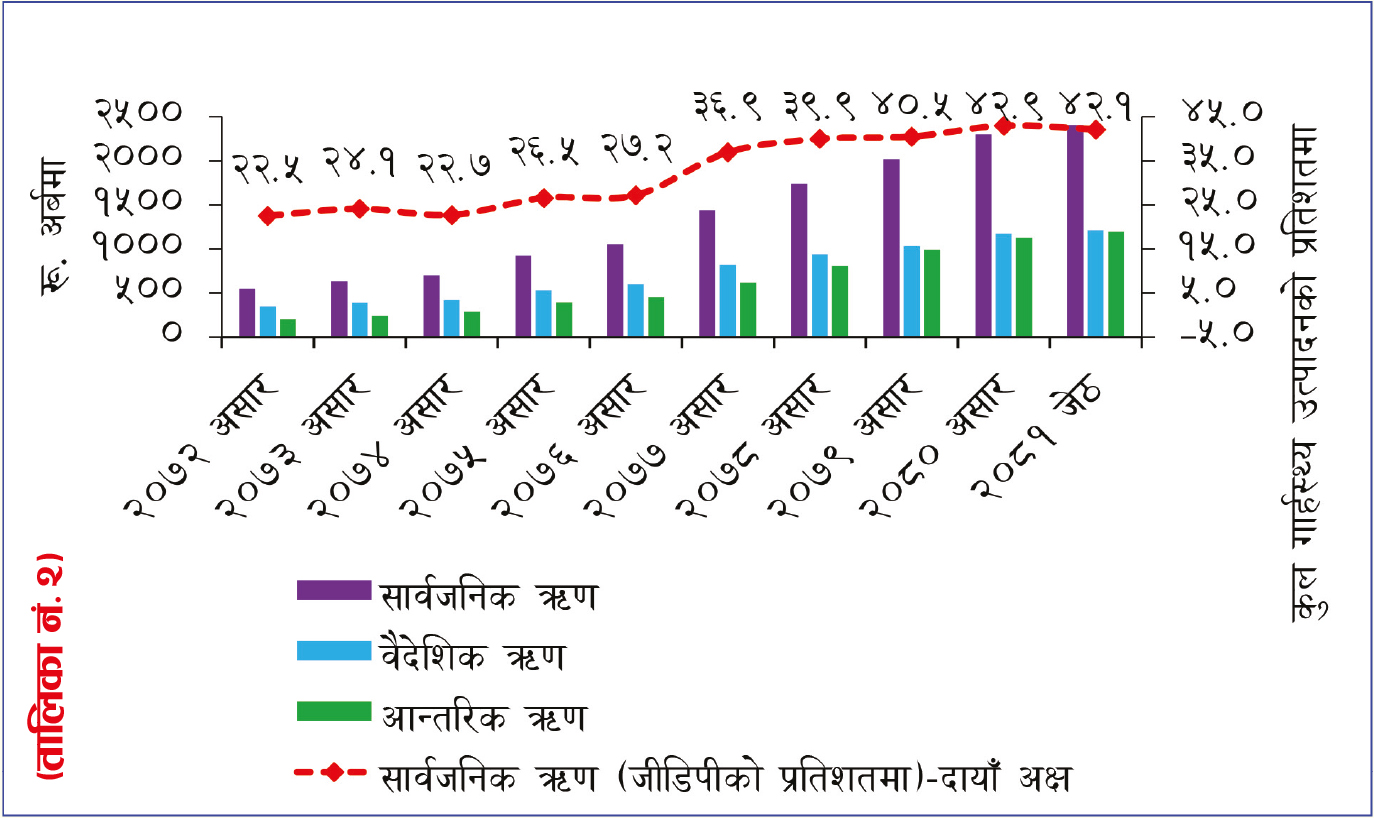 चालु आर्थिक वर्षको मसिंर मसान्तसम्म आइपुग्दा मुलुकको तिर्न बाँकी कुल सार्वजनिक ऋण कुल गार्हस्थ्य उत्पादनको ४४.१४ प्रतिशत (२५ खर्ब १८ अर्ब रूपैयाँ) पुगेको छ । जसमा आन्तरिक ऋण कुल गार्हस्थ्य उत्पादनको २१.५५ प्रतिशत (१२ खर्ब ५२ अर्ब) र बाह्य ऋण कुल गार्हस्थ उत्पादनको २२.१९ प्रतिशत (१२ खर्ब ६५ अर्ब) रहेको छ । २०७२ असारमा यस्तो ऋण कुल गार्हस्थ्य उत्पादनको २२.५ प्रतिशत (५ खर्ब ४५ अर्ब) रहेको थियो ।